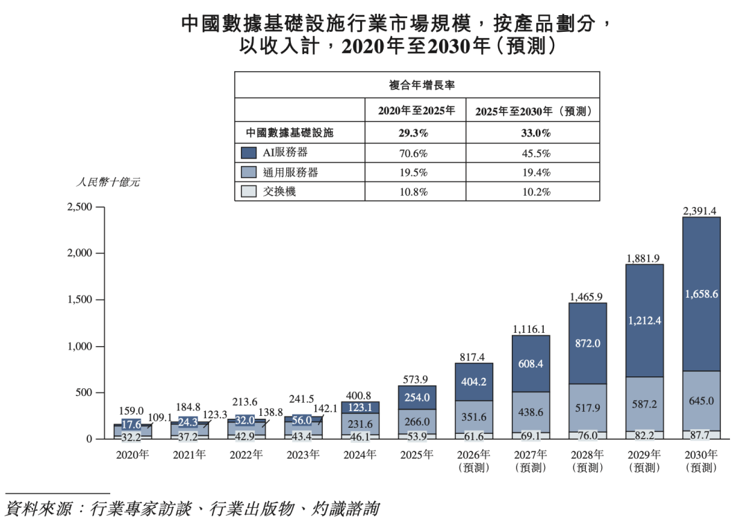 按收入计,全球AI服务器市场规模由2020年的人民币1130亿元跃升至2024年的人民币7548亿元,复合年增长率为60.7%,预计2030年将达人民币28001亿元,占全球数据基础设施市场规模的56.0%。