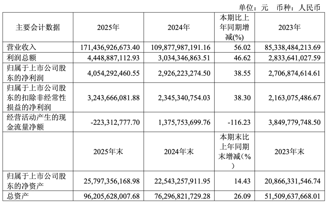 据其发布的2025年度业绩报告显示,公司实现营业收入1714.36 亿元,同比增长56.02%;实现归属于上市公司股东的净利润为40.05 亿元,同比增长38.55%。
