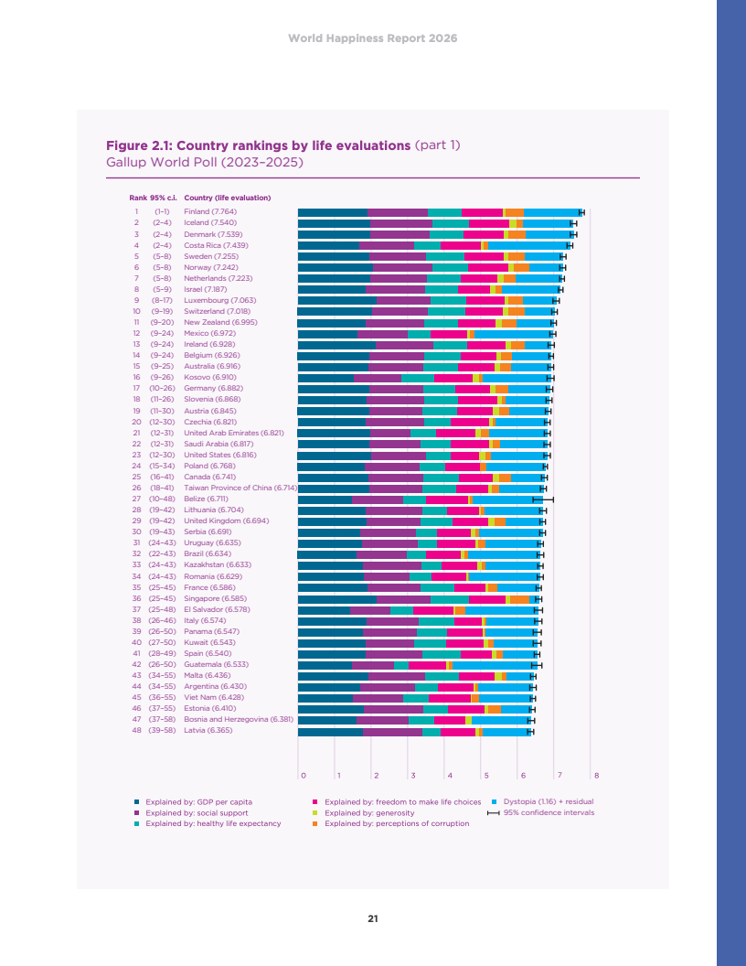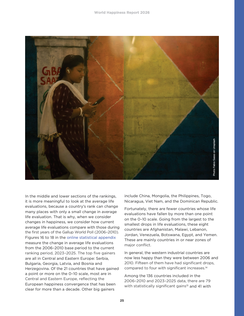全球幸福格局呈现出结构性分化趋势。根据报告数据,在136个国家中,有79个国家的幸福水平较2006-2010年显著上升,而仅41个国家出现下降。北欧国家继续主导排名,芬兰以7.764分稳居第一,而阿富汗则仅为1.446分,二者差距超过6分,凸显全球幸福鸿沟仍然显著。值得关注的是,中东欧国家成为主要“追赶者”,21个幸福提升超过1分的国家多数集中于该区域,显示制度与经济收敛带来的长期红利。