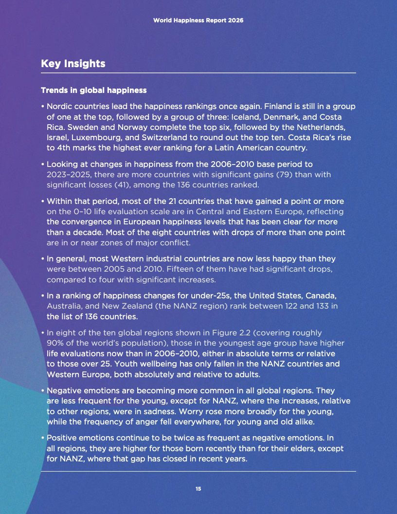 青年幸福的区域性断裂尤为突出。在85个国家,25岁以下人群的幸福感较20年前有所提升,但美国、加拿大、澳大利亚和新西兰却平均下降0.86分。同时,这些国家在青年幸福变化排名中位列第122至133位,处于全球末端。这一趋势与西欧同步出现,构成少数“逆全球趋势”的区域,显示发达经济体在青年心理福祉方面面临系统性挑战。
