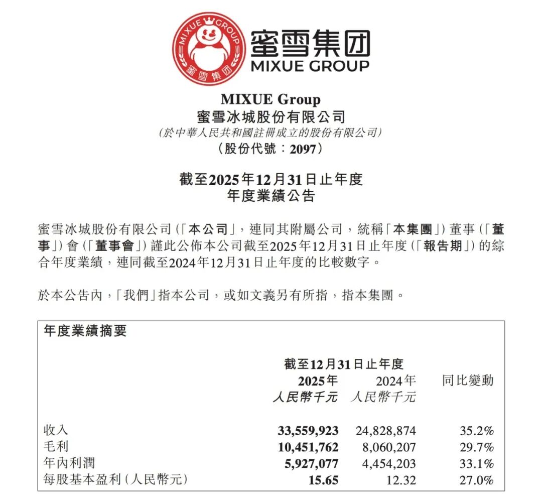 蜜雪集团于昨日午间发布 2025 年度业绩公告。总体来看:2025 年,蜜雪集团实现营收 335.6 亿元,同比增长 35.2%,略高于分析师平均预期的 329.4 亿元;毛利 104.5 亿元,同比增长 29.7%;归母净利润 58.8 亿元,同比增长 32.7%;净利润增长 33.1% 至 59.3 亿元,超越市场共识预期的 31% 增幅,每股基本盈利为人民币 15.65 元。毛利率方面存在结构性压力,商品与设备销售毛利率由 31.2% 降至 29.9%,销售成本增速(37.8%)快于营收增速(35.2%)。瑞银分析师 Christine Peng 预计今年毛利率将进一步收窄。值得一提的是,蜜雪冰城全球门店扩张至 59823 家,净增约 13000 家;其中内地门店达 55356 家,三线及以下城市占比约 58%;而海外门店则由 4895 家小幅收缩至 4467 家。财报公布后,港股蜜雪集团午后涨超 8%,报 349.00 港元。《穿普拉达的女王 2》定档 4 月 30 日