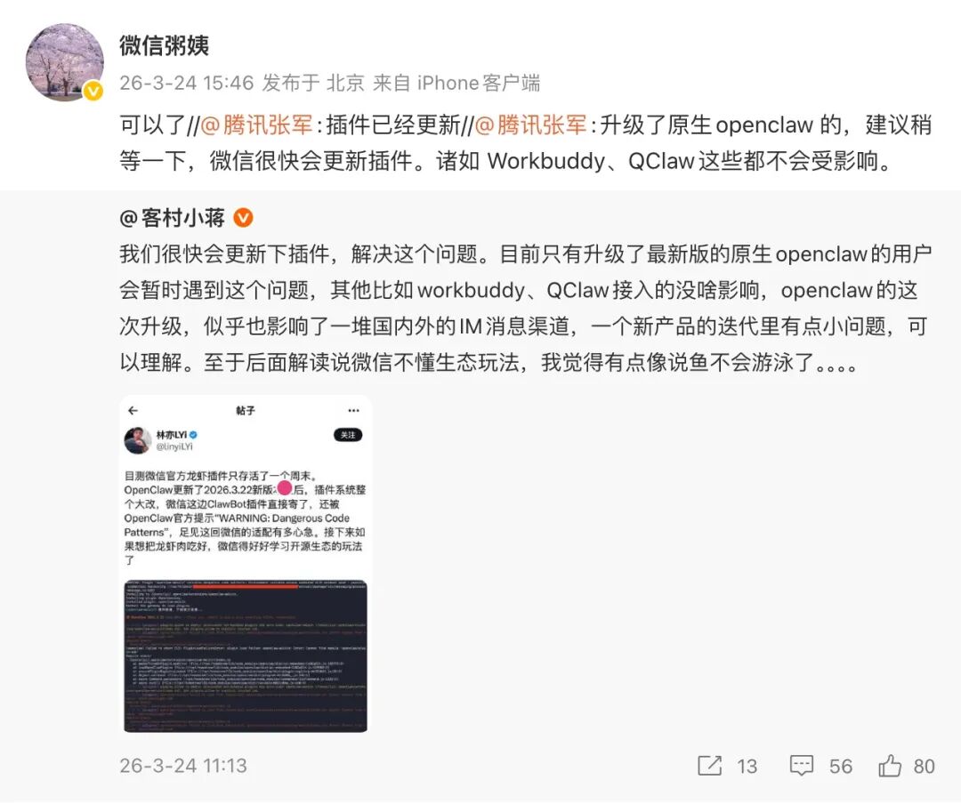 近日,OpenClaw 发布 2026.3.22-beta.1 版本,进行了一次涉及插件系统的重大重构,进而导致微信官方 ClawBot 插件在 OpenClaw 更新后陷入无法运行的状态。🔗 相关阅读:微信龙虾插件上线72小时,就被OpenClaw一次更新干崩了据悉,此次重构的核心改动,是删除了原有的统一模块入口 openclaw/plugin-sdk,强制要求所有插件改用细分路径(如 openclaw/plugin-sdk/core)按需加载所需功能。据 OpenClaw 官方解释,此次重构旨在实现按需加载,以提升启动速度、降低内存占用,同时通过阻断相对路径的跨包访问来强化安全隔离,防止插件越权读取本地其他数据。但更新日志中明确注明「no compatibility shim」,不提供任何兼容过渡方案。由于微信 Clawbot 插件代码依赖原有路径,导致 OpenClaw 在运行环境下找不到对应模块,最终微信内与 Clawbot 的所有对话完全失效。同期受波及的还包括企业微信、飞书等多个 IM 渠道的相关插件;QQ Bot 虽在更新过程中触发了静态代码扫描警告,但由于警告不阻断运行,实际使用未受影响。事件发酵后,微信员工「@客村小蒋」昨日在微博回应称「我们很快会更新下插件,解决这个问题」,并表示「openclaw 的这次升级,似乎也影响了一堆国内外的 IM 消息渠道,一个新产品的迭代里有点小问题,可以理解」。据腾讯腾讯公关总监张军昨日下午消息,目前微信 Clawbot 插件已完成更新并修复相关问题。另据媒体报道,OpenClaw 本次更新还导致浏览器扩展 Relay 功能因路径移除而失效,MiniMax 等国产模型配置异常,Windows 沙箱出现权限错误。「龙虾之父」Peter Steinberger 还发文提到,发布新版本时人为漏掉了一个处理「网页控制界面资源」的步骤。这导致用户下载的当前版本无法正确加载网页控制界面。为了避免以后再犯这种「人为漏掉步骤」的失误,他目前正在把整个软件的发布流程做成自动化,并且正在为网页端添加端到端测试;这样以后代码写完后,机器会自动进行全面测试并打包发布。魅族:已和多家硬件厂商谈 Flyme 合作
