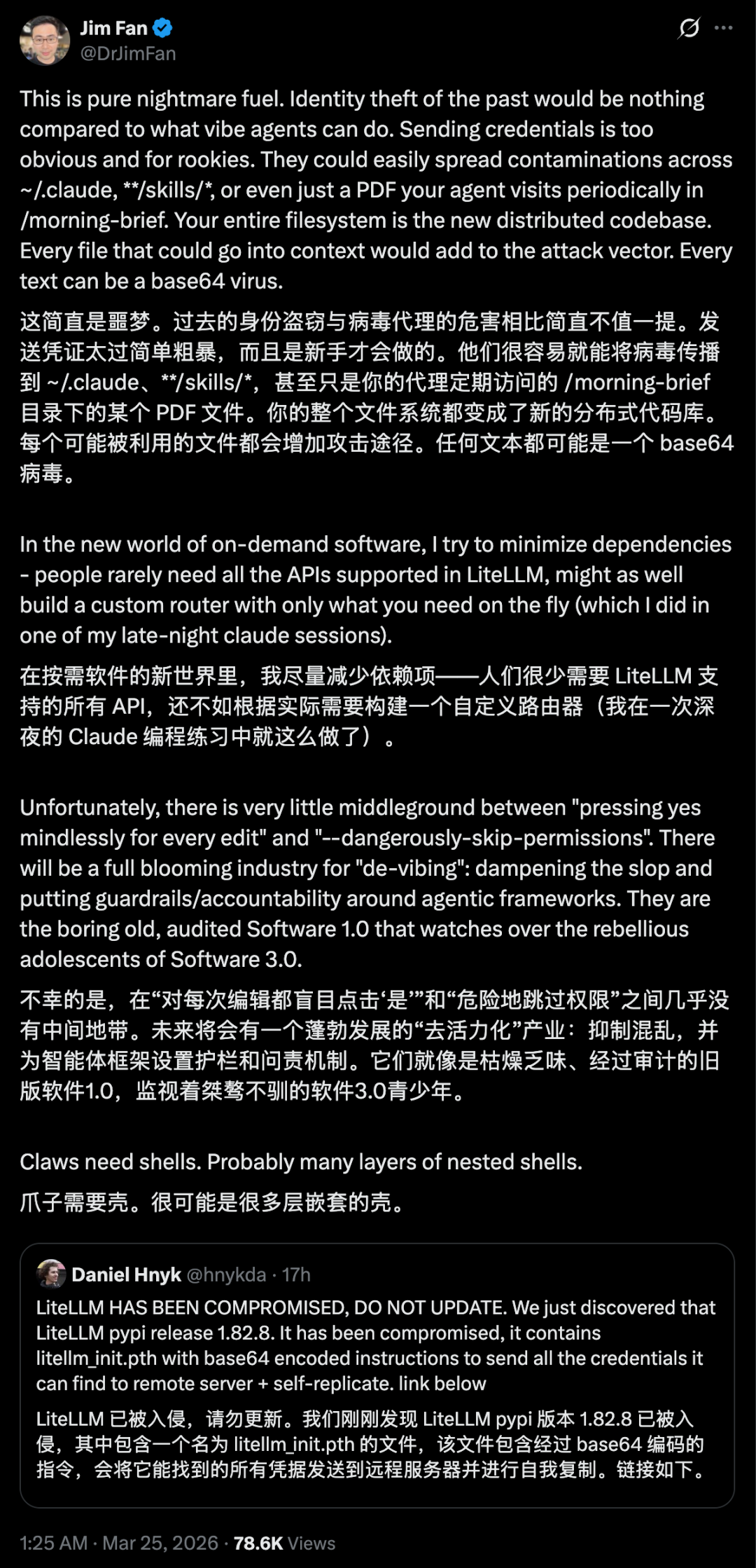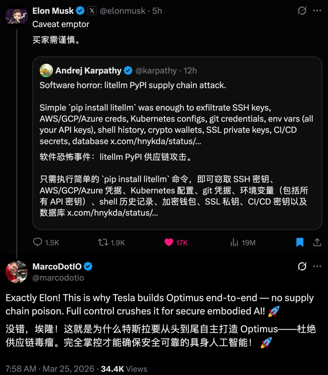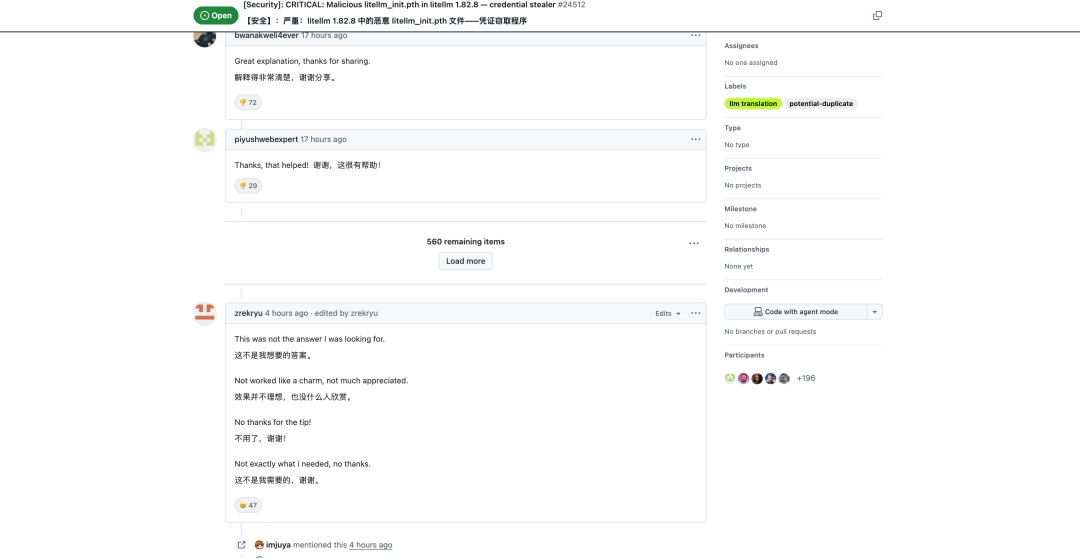 GitHub 上四万颗星,日均下载 340 万次,几乎是 AI 开发者电脑里都会出现的基础设施。只要你用过它,或者用了任何一个间接依赖它的工具,你电脑上的东西就会被打包带走:远程连接的私钥、AWS/GCP/Azure 各种云账号、部署平台密钥、加密货币钱包、数据库密码,还有你放在 .env 文件里的所有 API Key。不需要点任何钓鱼链接,不需要下载任何可疑文件,甚至不需要犯任何错误;代码装上,它就自己跑了。根据 BleepingComputer 报道,有消息人士透露,不到 1 小时,约 50 万台设备中招。但整件事最离谱的地方在于,这波攻击之所以被发现,靠的完全是运气。黑客自己写的恶意代码里有个 bug,把一台机器的内存直接撑爆了。官网写着「Y Combinator 支持」,主要的功能是用同一套代码接入 ChatGPT、Claude、Gemini 等几十个大模型,每月下载量接近 1 亿次。项目官网:https://www.litellm.ai/它的位置,刚好卡在用户和所有 AI 工具之间。大量 MCP 插件、Agent 框架,底层都依赖这个 Python 包。就算你从来没主动装过 LiteLLM,只要你用了任何一个依赖它的库,你就已经暴露了。黑客组织 TeamPCP 显然也看中了这一点。他们没有直接去攻击 LiteLLM 的服务器,而是选了一条更阴的路:供应链攻击。怎么理解?普通黑客攻击,是去撬你家门锁。供应链攻击,是在锁出厂之前,就已经设置了一个缺口。他们盯上的突破口,是 Trivy。这是一个开源安全扫描工具,相当于代码发布流水线上的保安,前不久 Trivy 也曾报告遭受过 AI 攻击,一度清空了项目仓库。黑客也是看中了这点,篡改了 Trivy 的自动提交配置。当 LiteLLM 照常发布,毫无防备地拉取这个被污染的「保安」进行安全检查时,黑客顺手就拿到了发布包的密钥。接下来的操作就很丝滑了。拿着官方密钥,他们大大方方地发布了带有恶意代码的 LiteLLM 1.82.7 和 1.82.8 版本。因为签名是真的,所有常规校验全部通过。在系统看来,这个有剧毒的安装包,就是一个有着官方签章的安全发行版。更让人后背发凉的是这次的投毒手法,黑客利用了 Python 的启动钩子机制。简单说,你不需要写一行代码来引入这个有毒的库。只要在终端敲一行 pip install,恶意代码瞬间激活。毫不夸张的说,只要你启动了 Python,它就在跑。相关的事件报告:https://snyk.io/articles/poisoned-security-scanner-backdooring-litellm它会扫你本地的环境变量、远程连接密码,精准抓取 AWS、Google Cloud 的连接凭证。如果你是 AI 开发者,它会翻遍你本地存的所有大模型 API Key。如果是加密货币玩家,比特币、以太坊钱包的助记词,也会被打包成一个名叫 tpcp.tar.gz 的压缩包,加密处理后,悄悄发送到黑客前一天刚注册的伪装域名 models.litellm.cloud 上。攻击链路,教科书级别,但是毁在了一个无限套娃的 bug 上。FutureSearch 的开发者 Callum McMahon,需要在 Cursor 里跑一个 MCP 插件。插件安装依赖的时候,顺带拉了最新版的 LiteLLM。排查了一阵后,他在 LiteLLM 1.82.8 里找到了元凶:一段隐藏的恶意代码,每次 Python 启动都会自动运行,疯狂启动子进程,子进程再触发同样的恶意代码,然后继续启动新的子进程。病毒原本的计划是安静潜伏,悄悄打包你的密钥带走。结果因为这个失控的递归 bug,直接把电脑卡到明面上了。有网友说,这黑客的攻击代码,搞不好也是 AI vibe coding 出来的。考虑到 bug 的低级程度,这个猜测的可信度其实不低。目前,反馈这个问题的帖子有超过 560 条回复,里面大多数是机器人在为自己的主人,推销相关的安全产品顺藤摸瓜之后,这位开发者火速冲到 LiteLLM 的 GitHub 仓库提交了问题报告,试图给整个开源社区拉响警报。但他没想到的是,102 秒内,黑客动用了手里的开发者僵尸账号网络,往帖子下面灌了 88 条无关评论,试图把真正的警告淹没在垃圾信息里。紧接着,黑客直接登录了窃取来的 LiteLLM 维护者账号,用管理员权限强行关闭了讨论区。截至目前,恶意包已被官方隔离,LiteLLM 团队紧急重置了所有密钥。但在那失去防备的 3 个小时里,没有人知道,已经有多少开发者的密钥流进了暗网。这件事值得谈的不只是 LiteLLM 本身,而是它暴露出的整个生态的结构性溃败。在软件开发领域,「不要重复造轮子」几乎是圣经级别的准则。有现成的库就用现成的,把精力放在真正要做的事情上。这套逻辑让整个行业的效率飞速提升。随便打开一个 Python 项目,requirements.txt 里几十上百个依赖。每个依赖又有自己的依赖。真正的「依赖树」深达七八层,横跨几百个包,维护者分布在地球的各个角落,有的是大厂工程师,有的是在读学生,有的可能三年没登录过 GitHub 了。你以为你在信任一个包。你实际在信任一整棵你看不见全貌的树上的每一片叶子。这棵树上任何一个节点被攻陷,危险都会顺着依赖关系一路流到你的机器上。而你对此的防御手段是什么?看一眼包名,确认下载量够大,然后按回车。开源虽然公开透明,但不一定等于安全,他需要大量精力去审核开源安全的底层假设是「足够多的眼睛在看,所有的 bug 都无处可藏」。但 2026 年的现实是,不是看的眼睛不够多,而是没有人再用眼睛看了。PyPI 没有强制的包签名验证机制,npm 的 provenance 功能普及率极低。大多数包管理器对「这个版本是不是真的由官方发布的」这个最基本的问题,至今无法给出可靠的回答。安全基础设施还停留在「Linus 定律」的田园时代。而 AI 带来的新用户,正在以每月数百万的速度涌入。