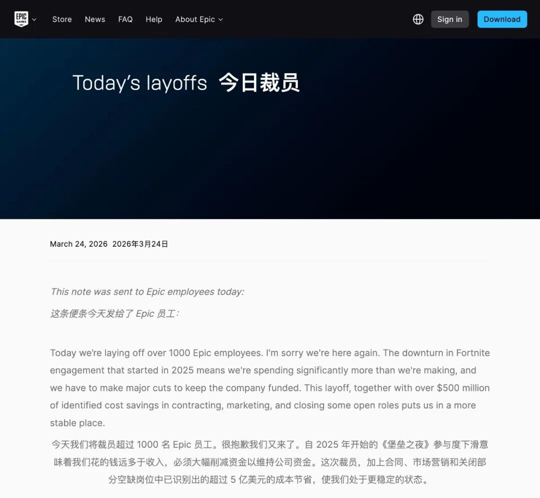 Epic Games 近日宣布将裁员超 1000 人,直接原因是《堡垒之夜》自 2025 年起用户参与度持续下滑,导致公司支出远超收入。裁员后,Epic 仍有超 4000 名员工。受影响员工将获得至少四个月基本薪资的遣散补偿,具体金额视工龄而定。CEO Tim Sweeney 在公开信中将此次挑战分为行业共性问题与 Epic 自身问题两类:行业层面,增长放缓、消费疲软、当前一代主机销量低于上一代,以及游戏须与其他娱乐形式争夺用户时间;Epic 自身层面,尽管《堡垒之夜》仍是全球最成功的游戏之一,但公司在「每个赛季持续创造『《堡垒之夜》式奇迹』」方面遭遇困难;重返移动端并针对全球数十亿智能手机优化《堡垒之夜》的工作仍处于早期阶段。针对外界对 AI 取代开发者的担忧,Sweeney 在公开信中明确表示:「此次裁员与 AI 无关。」他强调,只要 AI 能够提升生产效率,公司希望拥有尽可能多的优秀开发者。快手 2025 年财报:日活破 4 亿,AI 单月收入破 2000 万美元