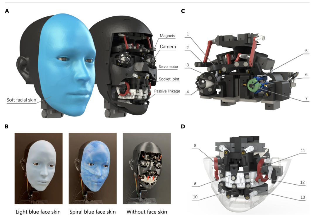 胡宇航团队设计了一个 10 自由度的唇部驱动机构,配合柔性硅胶唇部,能覆盖 24 个辅音和 16 个元音对应的唇形。