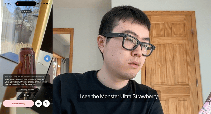 VisionClaw 的创始人 Xiaoan Liu 分享了一个更加具体并且有趣的用例:他面前有一瓶饮料,于是他呼出眼镜的 VisionClaw 助手,直接说「帮我把这个饮料放进我的 Amazon 购物车」,AI 首先识别出了这是一瓶魔爪草莓味能量饮料,然后操作浏览器,进入 Amazon 官网,进行搜索后将商品加购。
