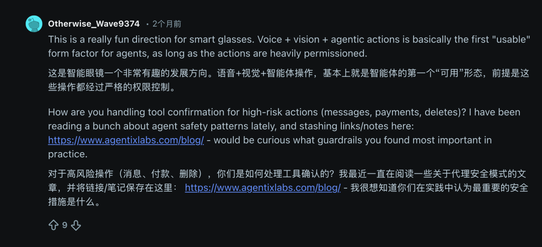 上线两个月,VisionClaw 吸引了不少极客网友的注意,一些网友认为,这种「语音 + 视觉 + 智能体操作」的方案,几乎就是 AI Agent 第一个「可用形态」。
