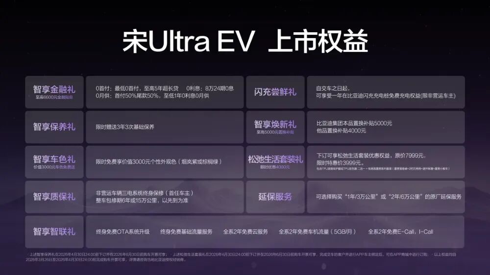就在今晚,比亚迪正式举行发布会,发布了宋Ultra EV。据介绍,新车提供四款车型,包括605KM领先型、605KM超越型、710KM超越型和710KM卓越型,官方指导价15.19万-17.99万元。新车全系搭载比亚迪第二代刀片电池及闪充技术,同时拥有710公里CLTC纯电续航、天神之眼B、云辇-C、TBC高速爆胎稳行系统等豪华配置,为消费者带来全新的纯电出行方式,能胜任多元化出行需求。此外,宋Ultra EV带来了新的“0元购、0元用、0元养”的超重磅购车权益。车身尺寸方面,新车的长宽高为4850×1910×1670mm,轴距2840mm,定位B级纯电SUV。外观方面,宋Ultra EV采用家族化设计语言,整体造型比较稳重。宋Ultra EV提供火岩灰、雪山白、烟岚紫、星河米、棕榈绿、曜石黑六种外观配色供选择。内饰方面,宋Ultra EV走简洁和年轻化设计路线,目前提供海盐灰内饰颜色,后续会开放暮云灰可选。新车全系标配15.6英寸中控大屏、四音区语音交互、手机无线充电等20+项核心配置。智能化方面,宋Ultra EV可选装天神之眼B-辅助驾驶激光版(DiPilot 300),天神之眼 5.0搭载最新大模型版本,可实现路口自主过红绿灯、窄路从容调头、停车场稳稳泊车,还能应对极窄场景、复杂掉头,城区拥堵主动切换辅路等复杂操作。此外,新车还支持一键远程备车,提前开启空调、座椅通风加热;车机远程餐厅排号,美味无需苦等;轻敲前备箱解锁;多功能扩展接口超实用,装手机支架、运动相机;魔方传声筒传递温暖叮嘱;小憩模式伴助眠白噪声。16扬迪声音响系统,打造音乐厅级听觉盛宴。动力方面,新车全系后驱搭载最大功率270千瓦的单电机,最高时速可达210km/h。搭载比亚迪第二代刀片电池,支持闪充,续航有605km和710km两个版本可选。底盘方面,新车全系标配云辇-C智能阻尼车身控制系统,搭配前麦弗逊+后五连杆独立悬架,同时还配备了TBC高速爆胎稳行系统。目前新车已经正式开售,感兴趣的小伙伴可以了解一下。苹果WWDC26前瞻,iOS27为折叠iPhone进化!8499 华为Mate80ProMax风驰版发布丨无感出风设计加持