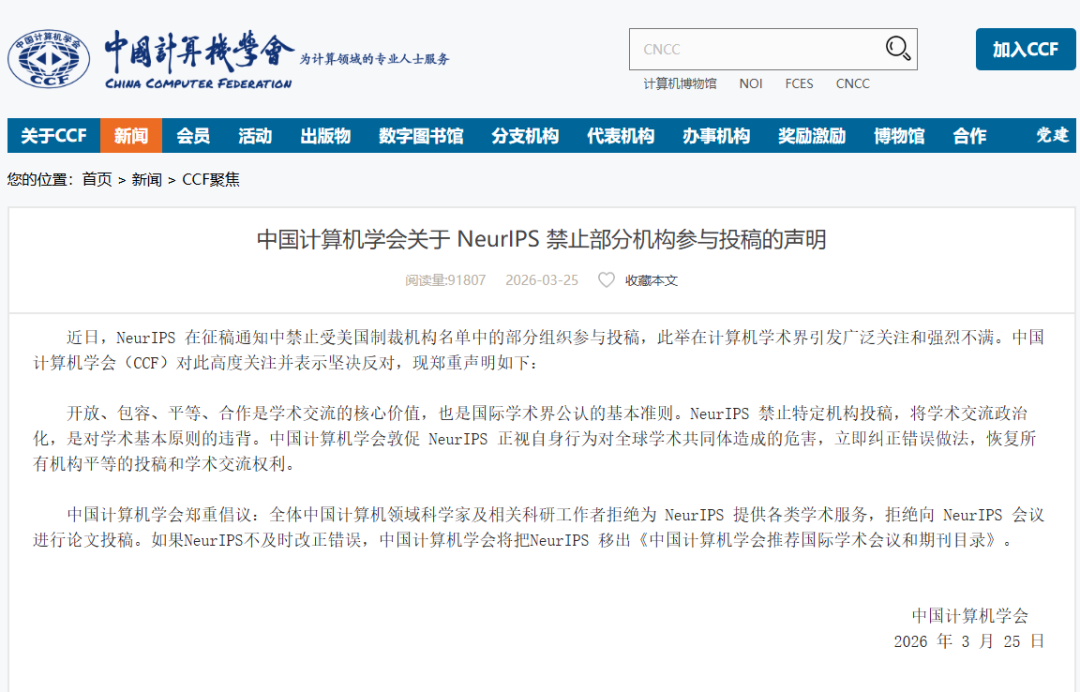 3月25日,中国计算机学会(CCF)发布声明称,对此高度关注并表示坚决反对,并指出,开放、包容、平等、合作是学术交流的核心价值,也是国际学术界公认的基本准则。NeurIPS禁止特定机构投稿,将学术交流政治化,是对学术基本原则的违背。中国计算机学会敦促NeurIPS正视自身行为对全球学术共同体造成的危害,立即纠正错误做法,恢覆所有机构平等的投稿和学术交流权利。中国计算机学会郑重倡议:全体中国计算机领域科学家及相关科研工作者拒绝为NeurIPS提供各类学术服务,拒绝向NeurIPS会议进行论文投稿。如果NeurIPS不及时改正错误,中国计算机学会将把NeurIPS移出《中国计算机学会推荐国际学术会议和期刊目录》。