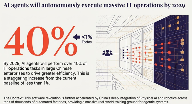 到2029年,大型中国企业中将有超过40%的IT运维任务由AI智能体完成,而目前这一比例不足1%。金玮指出,AI智能体可通过对话式交互实现问题分流、初步诊断与自动化处理,极大提升效率。