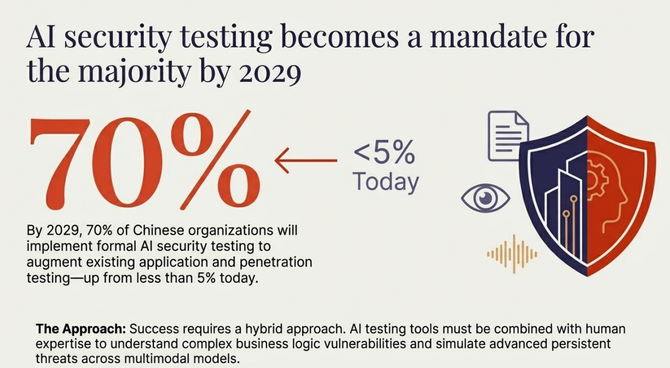 随着AI工具在企业中快速普及,安全风险也在同步上升。Gartner预测,到2029年,70%的中国企业将把AI安全测试作为现有应用安全测试的补充,而目前这一比例不足5%。