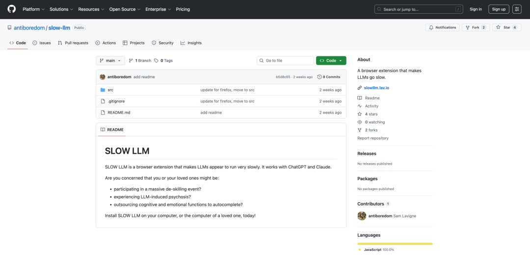 昨晚开始 DeepSeek 崩了,工程师奋战12 小时后早上终于修复。这次宕机引发网友一片哀嚎,因为对很多人来说,「生活已经不能没有 AI 了。」这句话,越来越多的人说出口时,语气已经不像抱怨,更像陈述一个事实。写作业问 AI,理思路问 AI,不知道吃什么也问 AI。顺滑、即时、永远在线,我们已经默认 AI 就应该如此。但从来如此,便对吗?官方宣传语:你是否隐隐担忧,自己或身边的人正在:参与一场席卷所有人的技能大退化?遭受 LLM 诱发的认知扭曲?把思考和情感,一并外包给 AI 自动补全?现在就把 SLOW LLM 装进你的电脑,或者你在乎的人的电脑吧!🔗一个名为 Sam Lavigne 的大学教授,最近发布并开源了一款名为「Slow LLM」的 AI 工具。顾名思义,它做的事情十分「缺德」且专一:让 Claude、ChatGPT、Grok 甚至 Gemini 的响应速度,变得极其、极其缓慢。浏览器每次从服务器拉取数据,都要经过一个叫 Fetch 的 JavaScript 函数。你问 ChatGPT 一个问题,它的回答从 OpenAI 服务器出发、抵达你的页面,中间就是靠这个函数完成传输的。Slow LLM 做的事情,是在你访问 AI 聊天网站的时候,悄悄把这个函数替换掉。换成一个长得一样、但会故意拖延的版本。数据其实已经到了,只是被一点一点、极其缓慢地释放给页面。所以你得到的那段漫长的等待,是真实的体验,背后其实没有任何技术故障。OpenAI 的服务器正常运转,Claude 的推理没有卡住,网络也没有问题。整件事只是 Lavigne 的几行代码在中间「掐着水管」。考虑到易用性,Slow LLM 提供了两种部署方式。第一种是安装 Chrome 插件,只影响你自己的设备,随时可以关掉。APPSO 也实测过,装上之后效果确实相当明显,对话框里的文字一个字一个字往外蹦,有种等待网页加载的那种煎熬。第二种是走「企业版」路线,把家里路由器的 DNS 服务器改成 Lavigne 提供的自定义地址,整个网络上的所有设备同时受影响,覆盖 Claude、ChatGPT,DNS 版本还能顺带拖慢 Grok 和 Gemini。Lavigne 已经在 Github 上把代码全部开源,自建 DNS 对有一点技术基础的人来说并不困难。他自己还没在「毫不知情的人」身上测试过,但说他在考虑。Github 地址:https://github.com/antiboredom/slow-llm看到这里,你一定满头问号: Lavigne 图什么?要理解 Lavigne 的脑回路,先得知道他是什么人。公开资料显示,他目前是德克萨斯大学奥斯汀分校设计系的助理教授,此前在纽约大学和帕森斯设计学院都待过。他的研究和创作长期围绕着互联网数据、自动化与算法正义打转。换句话说,他不是随手搞了个恶作剧的黑客,他花了很多年在严肃地思考,计算系统是如何悄悄重塑人类行为的。想要理解他的逻辑,我们还需要先搞懂硅谷产品经理们最痛恨的一个词:摩擦(Friction)。一个多余的跳转按钮是摩擦,支付时需要输入密码是摩擦,甚至 AI 回复慢了两秒,也是不可饶恕的摩擦。过去这十几年,产品经理的核心逻辑就是消除一切「摩擦」,提高转化率高,提高体验的丝滑度。Lavigne 认为,LLM 把这个逻辑推到了一个让人不安的极端。任何让你感到困难或不适的认知劳动,现在都可以外包。写邮件太费脑子?外包。不知道该不该道歉?外包。今天情绪低落找不到原因?也可以外包。AI 正在把自己变成一个什么都能接的垃圾桶,接管一切你不想自己做的思考。这听起来像是一件好事。效率提高了,烦恼变少了,输出变多了。但人类最宝贵的独立思考步骤却在这个过程里悄悄消失了。学钢琴之所以值得,是因为它很难。一道卡住你三个小时的数学题之所以留下印象,是因为你在上面真实地挣扎过。写一封措辞困难的邮件,逼着你想清楚自己到底想说什么、对方会怎么理解——这个过程本身就是一种训练,哪怕结果不完美。Lavigne 观察到,他的学生和朋友们已经开始用 AI 处理那些本来可以靠自己完成的基本任务。写邮件、整理思路、做简单的决定。时间长了,他们开始忘记那些曾经学会的东西。于是他选择了一个很朴素的对策:如果 AI 让一切变得太顺滑,那就把阻力还回去,哪怕只是让你多等几分钟,让你有机会想一想「这件事我能不能自己来」。如果你翻过 Lavigne 的履历,就会发现他酷爱折腾互联网那些理所当然的规则。在 2021 年居家办公的高峰期,无数人被无休止的视频会议折磨得痛不欲生。当时,Lavigne 开发了一款神作——「Zoom Escaper」。这个工具可以在你的 Zoom 音频流里制造逼真的婴儿哭声、狂吠的狗、电钻声甚至糟糕的网络回音。只要你开启它,你的存在就会变得让所有参会者难以忍受,从而名正言顺地逃离会议。🔗 https://zoomescaper.com/他和他的搭档甚至还做过一个叫「Slop Avoider」的浏览器插件,功能是屏蔽掉 2022 年 11 月(ChatGPT 发布)之后的所有搜索结果,以此来躲避如今互联网上泛滥的 AI 垃圾内容。但相比于此前这些项目,Slow LLM 还有一个有趣的细节。Lavigne 在开发这个项目的时候,用的是 Claude。写了一部分代码之后,他把 Slow LLM 部署上去,Claude 开始变得极其缓慢,他才被迫靠自己把项目做完。是的,一个批评 AI 依赖的人,在做这件事的时候,自己也依赖了 AI。这种处境其实很普遍,只是大多数人不会主动说出来。你可能会在刷完半小时短视频之后发一条「短视频真的上瘾」,也可能会边点外卖边转发「外卖毁了厨艺」的长文。人对自己正在批判的东西产生依赖,几乎是一种很难绕开的处境。因为你没有办法从一个完全外部的位置批