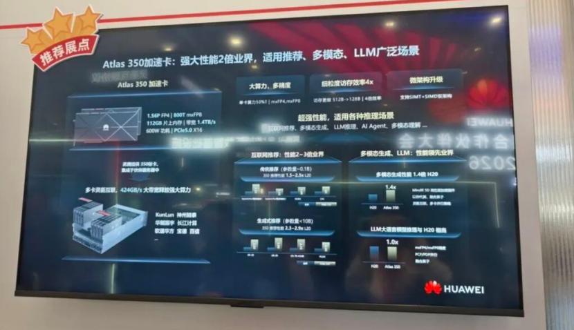 据介绍,Atlas 350加速卡单卡FP4算力达1.56P,带宽1.4TB/s,功耗600W,HBM容量为112GB,其算力约为英伟达H20的2.87倍。华为副总裁马海旭宣布该加速卡已正式上市。