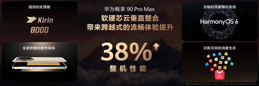 大众市场方面,华为畅享90系列全面升级,推出畅享90、畅享90 Plus、畅享90 Pro Max三款机型,全系搭载麒麟8系芯片,预装鸿蒙6.0系统,其中畅享90 Pro Max配备8500mAh超大容量电池,打造千元机“续航天花板”,定价1299元起,直击下沉市场与年轻消费群体需求。