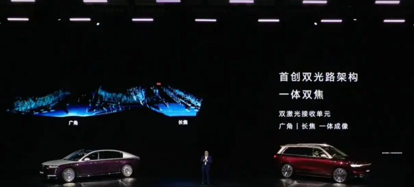 此外,新一代双光路图像级896线激光雷达采用了华为乾崑的双光路专利技术,其内部集成了广角与长焦两个不同焦段的激光接收单元。两个单元协同工作,实现一体双焦成像,形成广角与长焦画面结合的效果,可同时获取大范围路况信息与远处物体的细节。