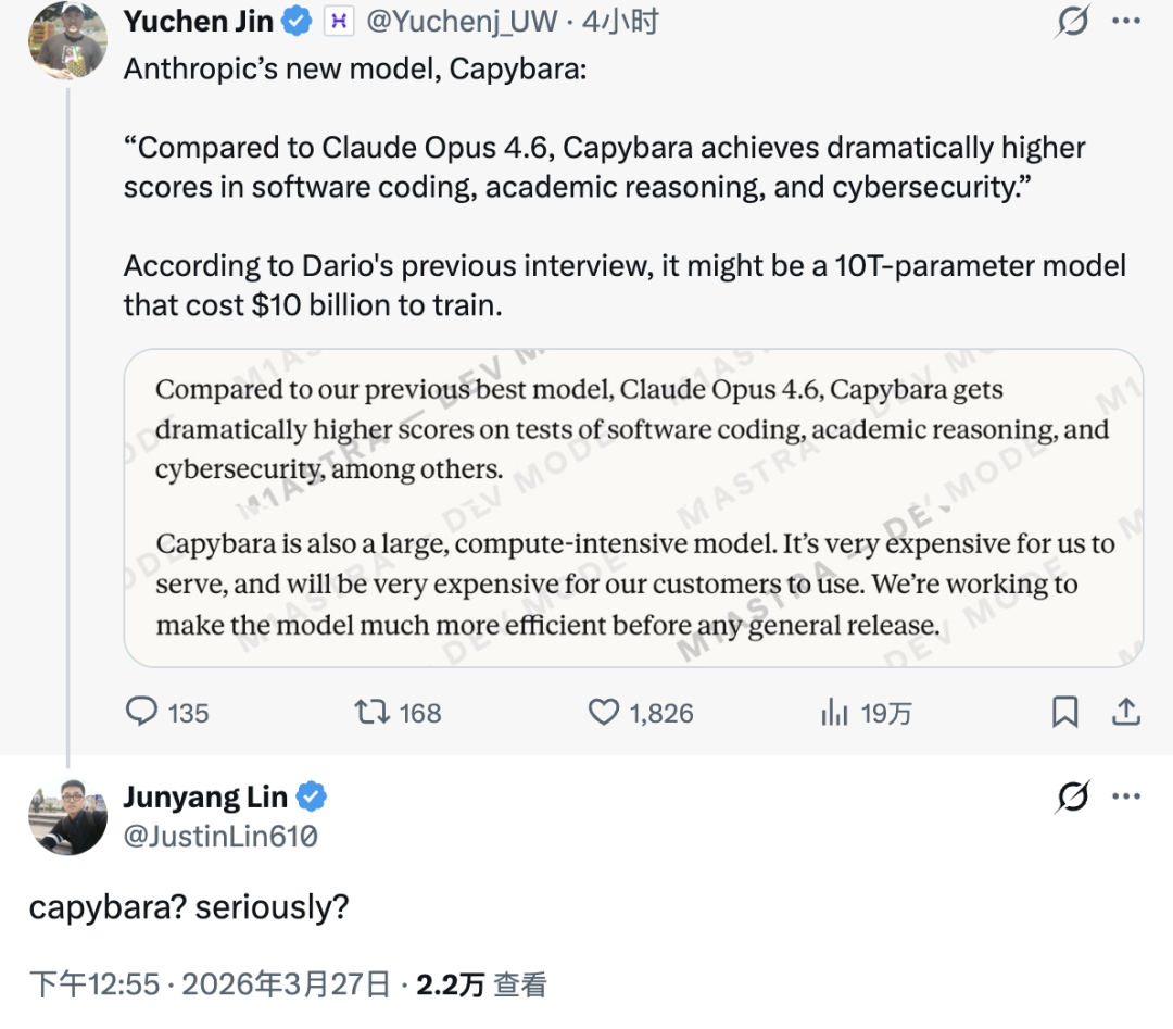 就在刚刚,Anthropic 泄露了一个从未公开过的新模型。没有小道消息铺垫,没有「知情人士透露」的前戏,Anthropic 自己的 CMS 数据库忘了关权限,近 3000 份内部文件直接躺在公网上,被《Fortune》记者翻了个底朝天。剑桥大学网络安全研究员 Alexandre Pauwels 受邀验证了这批材料的真实性和规模。Anthropic 发言人随后向《Fortune》确认:模型确实存在。好巧不巧,这个模型叫 Claude Mythos——内部代号 Capybara(卡皮巴拉)。当然,「卡皮巴拉」只是代号,Mythos 才是它的正式名称。这也和 Anthropic 对模型命名的逻辑一致,从小到大,能力从弱到强,是一个渐进的过程:这命名法,确实比友商堆数字、加后缀的方式要更有品味。值得一提的是:Mythos 没有采用 Opus 升级版的剧本,也跳过了 Sonnet 换皮的套路,直接开辟了一个凌驾于 Opus 之上的全新第四层级。Anthropic 自己在草稿里的原话:「Mythos 是一个全新层级模型的名字,比我们的 Opus 模型更大、更智能。在此之前,Opus 一直是我们最强大的模型。」觉得 Opus 4.6 已经够猛了?在 Mythos 面前,还只是热身而已呢。Anthropic 现有产品线是三层结构:Haiku 最轻最快,适合轻量任务;Sonnet 居中,性价比之选;Opus 最大最强,重型推理担当。这个框架从 Claude 3 时代延续至今,行业里几乎所有人都默认 Opus 就是 Anthropic 的天花板。然后 Mythos 过来准备把自家的天花板也掀了。泄露的草稿博文显示,与当前最强的 Claude Opus 4.6 相比,Mythos 在多个核心领域取得了「显著更高的分数」。至少覆盖了三大方向:软件编程。 这是当前 AI 模型竞争最白热化的战场。Claude Opus 4.6 本身已经是公认的编程最强模型之一,而 Mythos 在编程基准上进一步拉开了差距。对于每天用 Claude 写代码的开发者来说,这意味着一个量级的跃升,不是小数点后面的微调。学术推理。 数学、科学、逻辑推理,这些考验模型「深度思考」能力的硬骨头,Mythos 同样显著领先。草稿中特意把「学术推理」作为独立测试维度单独拎出来讲,说明 Anthropic 对这个方向的突破底气很足。草稿博文中有一段话,措辞之重,在 Anthropic 历来的官方叙事中极为罕见:尽管 Mythos 目前在网络安全能力上远超任何其他 AI 模型,但它预示着即将到来的一波浪潮,届时模型将能以远超防御者努力的速度来利用漏洞。Anthropic 发言人在确认 Mythos 存在时,用了两个定性:「质的飞跃」 和 「迄今为止最强大的模型」。过去两年,AI 模型的竞争一直在同一个量级上贴身肉搏。GPT 系列、Gemini、Claude、Llama,各项基准你追我赶,差距用个位数百分比来量。而 Mythos 暗示的已经不是追赶了,是变道超车。这大概就是为什么,每次 Anthropic 有大动作,社交媒体上总有人第一时间 @Sam Altman:睡了吗?业界早有传闻,自从 GPT-4 时代 OpenAI 痛失关键模型人才以来,后面的小版本和大版本其实都只是在狗尾续貂、亡羊补牢——这下子,奥特曼可能又要睡不着了。太强了怎么办?Anthropic 的答案是:先把解药发出去一家以「安全第一」立身的 AI 公司,在自己内部文档里承认造出了一个可能让攻击者碾压防御者的东西。这种坦率在行业里几乎没有先例。于是 Anthropic 做了一个罕见的决定:Mythos 的第一批用户,不是开发者,不是企业客户,而是网络安全防御机构。逻辑很简单:如果这个模型的攻击能力确实如内部评估所言,那在放给所有人之前,得先让守门的人拿到同样的武器。毒药还没散出去,解药先到位。这在 AI 行业的发布史上几乎没有先例。OpenAI 发 GPT-4 的时候做过红队测试,Google 发 Gemini 做过安全审查,但没有哪家公司把「安全防御者优先使用」写进正式的发布路线图里。Anthropic 这么做,要么是真的被自己造出来的东西吓到了,要么是在用一种极其高明的方式给 Mythos 的能力背书。又或者两者兼有。与此同时,Mythos 的运行成本是另一个现实问题。草稿坦承「服务成本非常昂贵」,需要大幅优化效率才会考虑面向大众。翻译一下:这只卡皮巴拉目前是实验室里的珍稀品种,想让它走进千家万户的聊天窗口,Anthropic 还得先把饲养成本打下来。但信号已经出去了。当竞争对手还在为 Opus 级别的模型绞尽脑汁时,Anthropic 已经在讨论 Opus 之上的东西该怎么安全地放出来了。每个大模型都有内部代号。GPT-4 叫过 Arrakis,Google 用宝石命名。而 Anthropic 给有史以来最强模型取的代号,是一只卡皮巴拉,就是那个在互联网上以「呆萌脸 + 跟谁都能和平共处」闻名的 meme 之王。怎么实锤的?泄露的博客有两个版本。V1 通篇用「Mythos」,V2 把每一个「Mythos」都替换成了「Capybara」,连文中每处引用都做了对应修改。说明这个模型在 Anthropic 内部相当长时间里就叫「卡皮巴拉」,「Mythos」是后来包装出来的发布名。但 AI 圈最知名的卡皮巴拉 IP 早就有主了。阿里通义千问 Qwen 的吉祥物就是卡皮巴拉,社区里到处是卡皮巴拉头像和周边,品牌认知度拉满。所以当 Mythos 的代号被曝光,社交媒体直接炸了。而全场最佳来自千问前技术负责人林俊旸亲自现身评论区,只留了一句:两家争夺 AI 王座的公司,不约而同看上了同一只呆头呆脑的大啮齿目。2026 年 AI 圈最有喜剧张力的一幕,大概就是这了。最后聊聊这次泄露本身,因为它的荒诞程度值得单独说。Anthropic 把原因归结为「外部 CMS 工具中的人工配置错误」,同时特意强调跟 Claude、Cowork 或任何 AI 工具无关。后半句的急切耐人寻味:最近多家科技公司因 A