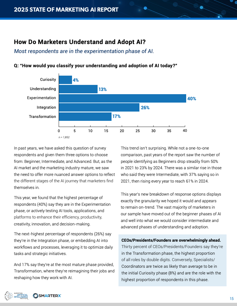 报告显示,营销行业正在快速跨越AI采用的“试验期”,进入实质性应用阶段。约40%的受访者已处于AI实验阶段,26%进入流程整合阶段,17%迈向业务重构阶段,意味着超过六成企业已脱离初级认知。与此同时,60%的营销团队已处于AI试点或规模化阶段,较2023年提升18个百分点,显示AI正从概念验证走向生产力工具。