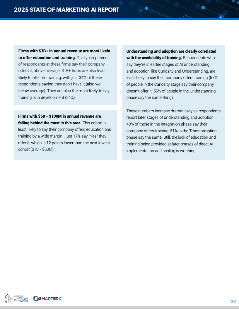 综合来看,营销AI正处于典型的“应用超前、治理滞后”阶段。短期内,效率红利将继续释放,但中长期竞争将取决于企业是否建立系统化能力,包括培训体系、治理框架与战略路线图。未来的分水岭不在是否使用AI,而在于能否将AI嵌入组织结构并实现规模化运营。
