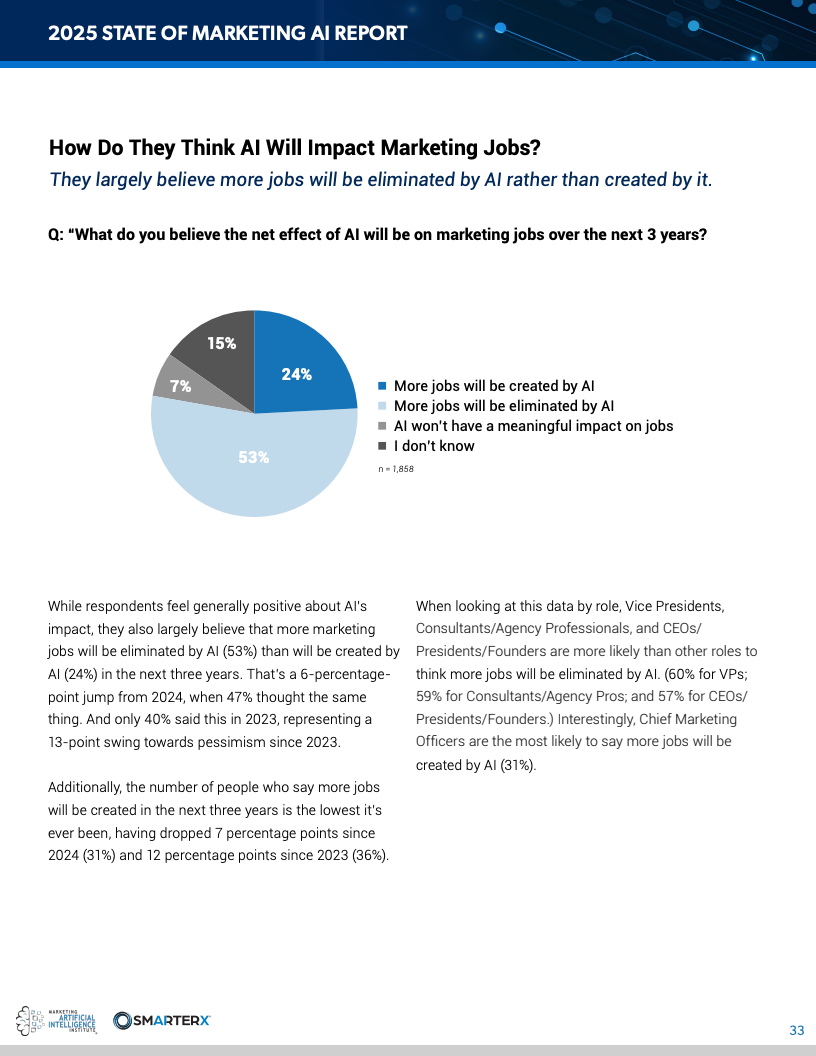 情绪层面呈现出“乐观与焦虑并存”的分化。70%的受访者对AI总体持积极态度,但53%认为未来三年AI将净减少营销岗位,较2023年上升13个百分点。与此同时,仅21%对自身岗位表示明确担忧,多数人处于观望状态。这表明个体对AI的认知尚未完全内化为职业风险判断。