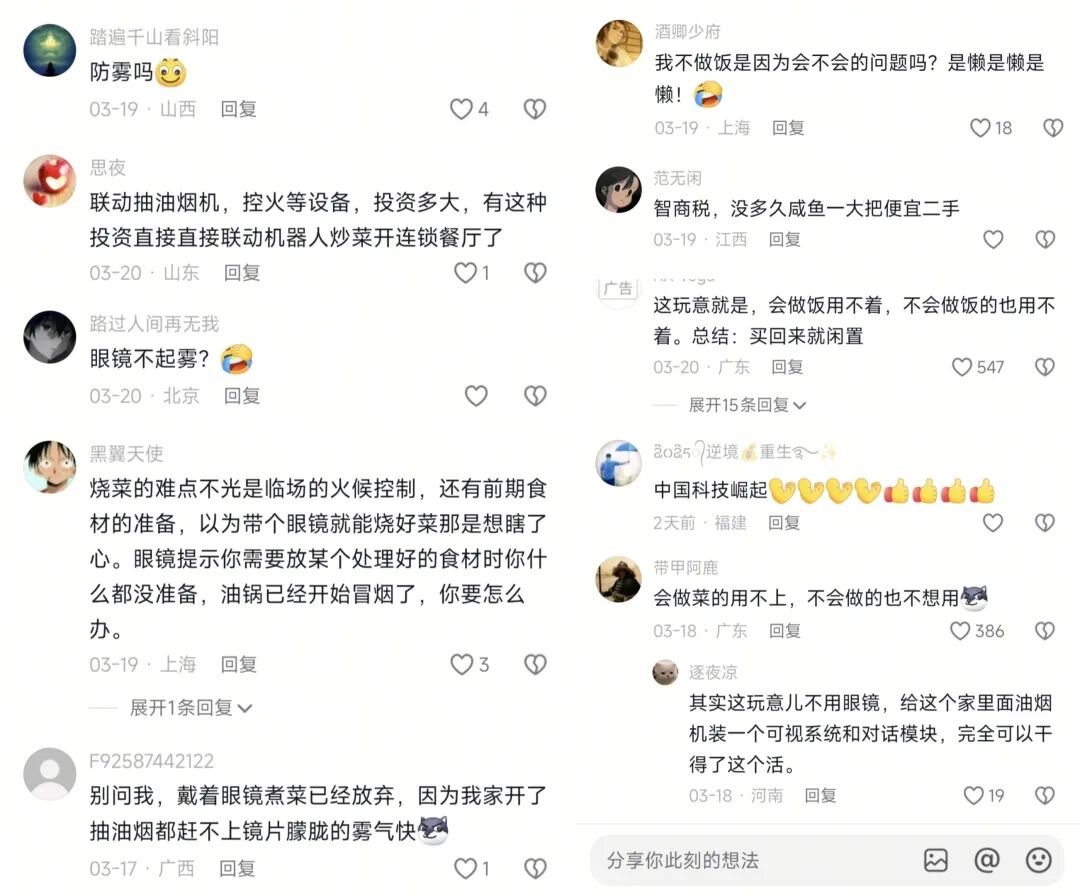 AI烹饪眼镜的诞生,需要技术上的突破,也需要贴合用户真实需求,解决实际痛点。AI厨电的需求还有待验证,现在很多市面上所谓的智能厨电功能确实酷,但用户用起来往往只是尝鲜一次便封存在角落。