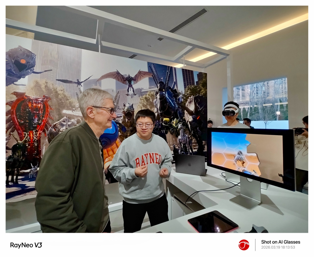 在更高层级的生态中,其也开始参与前沿探索。在不久前举办的苹果游戏盛会上,雷鸟创新作为唯一受邀的非传统游戏厂商展示了自研的空间计算游戏,并与Tim Cook展开交流,这一细节从侧面印证其已获得全球科技行业的高度认可,展示了雷鸟创新在AR内容生态的技术积累和抢跑优势。