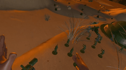 于是Khang Nguyen将项目推倒重来,沿用《Cry of Athena》的核心概念,将其重构为一款更简单的玩具兵沙盒游戏。由于新项目主要面向Meta Quest平台,他不得不重新学习开发流程,在社群中向其他开发者请教。要在Quest设备上同时运行数百个角色对于是无比艰巨的任务,使用Unreal 4引擎制作还需要解决兼容性问题。《Plastic Battlegrounds》从启动到首个版本发布只耗时3个月,“玩具兵”的概念果然引发了广大VR玩家的情感共鸣。