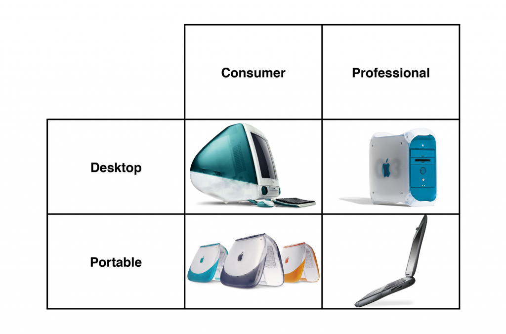 所以,乔布斯直接对整个产品线动手术,70% 的品类被去除,然后画了一个四宫格,将他们需要做的电脑品类数量压缩到最少。