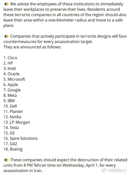当地时间3月31日,伊朗伊斯兰革命卫队(IRGC)通过社交平台发布官方声明,对包括NVIDIA、苹果、微软、谷歌在内的18家美国科技与金融企业发出直接军事打击威胁,明确将上述企业在中东地区的分支机构列为“合法打击目标”。这是伊朗方面继3月初发出同类警告后,在威胁层级上的显著升级。