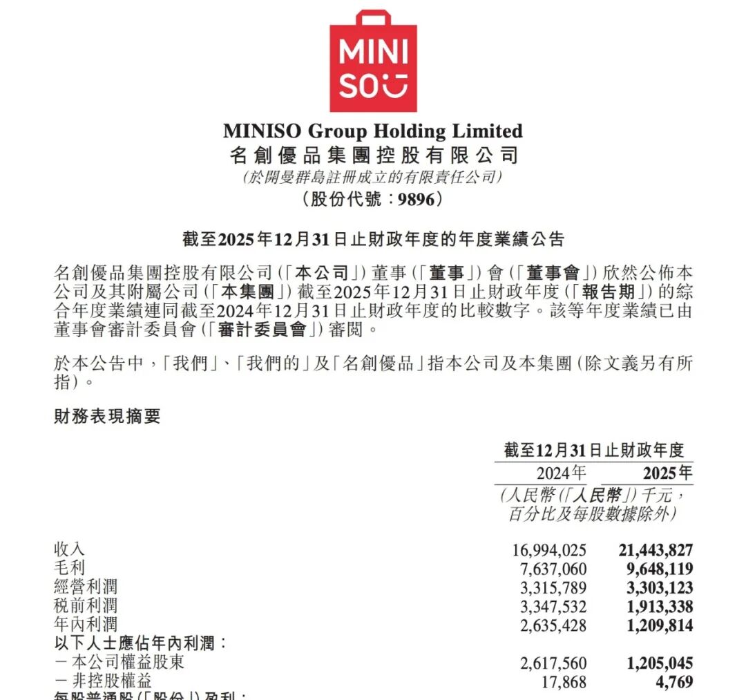 全年总收入达人民币 214.44 亿元,同比增长 26.2%;经调整净利润为人民币 28.98 亿元,同比增长 6.5%。受永辉超市亏损拖累,集团按国际财务报告准则计算的年内净利润大幅下滑至人民币 12.10 亿元,较上年同期的人民币 26.35 亿元减少约 54%,主要源于名创优品于今年第一季度完成对永辉约 29.4% 股权的收购。门店扩张方面,截至去年底,名创优品品牌全球门店总数达 8151 家,其中中国内地 4568 家,海外 3583 家,较 2024 年底净增 647 家。TOP TOY 门店增至 334 家,其中 30 家位于海外市场,这是 TOP TOY 自 2024 年四季度启动全球化以来的首次大规模海外布局。会员方面,中国内地名创优品累计会员总数突破 1.12 亿人,较上年增长 17.8%;美国市场累计会员数增长尤为突出,同比增长 150.3%,达约 440 万人。鸣鸣很忙交出首份年报,收入 661 亿元、县城门店占六成