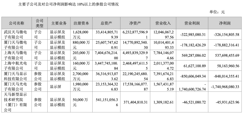 此外,从其2025年报中查询得知,深天马A旗下多家子公司仍处于巨亏之中,武汉天马微电子有限公司、厦门天马微电子有限公司分别亏损3.26亿元、1.78亿元,而参股公司厦门天马显示科技有限公司、厦门天马光电子有限公司则分别亏损17.4亿元、0.45亿元。