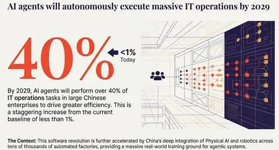 在自主运营方面,Gartner预测到2029年,大型中国企业中的AI智能体将承担超过40%的IT运营工作,而目前这一比例还不到1%。中国企业系统复杂、跨部门协作多,传统运营方式已难以应对指数级增长的工作量。AI智能体可通过对话式交互,实现问题分流、初步诊断和效率提升。但金玮也提醒,这并不意味着完全“无人化”,AI幻觉风险和控制机制不成熟决定了关键节点仍需人工监工。企业应从简单任务试点,逐步扩展到复杂场景,同时建立人机协作框架,培养AI工程师、AI架构师等新型岗位。