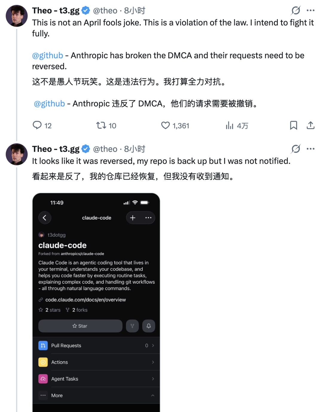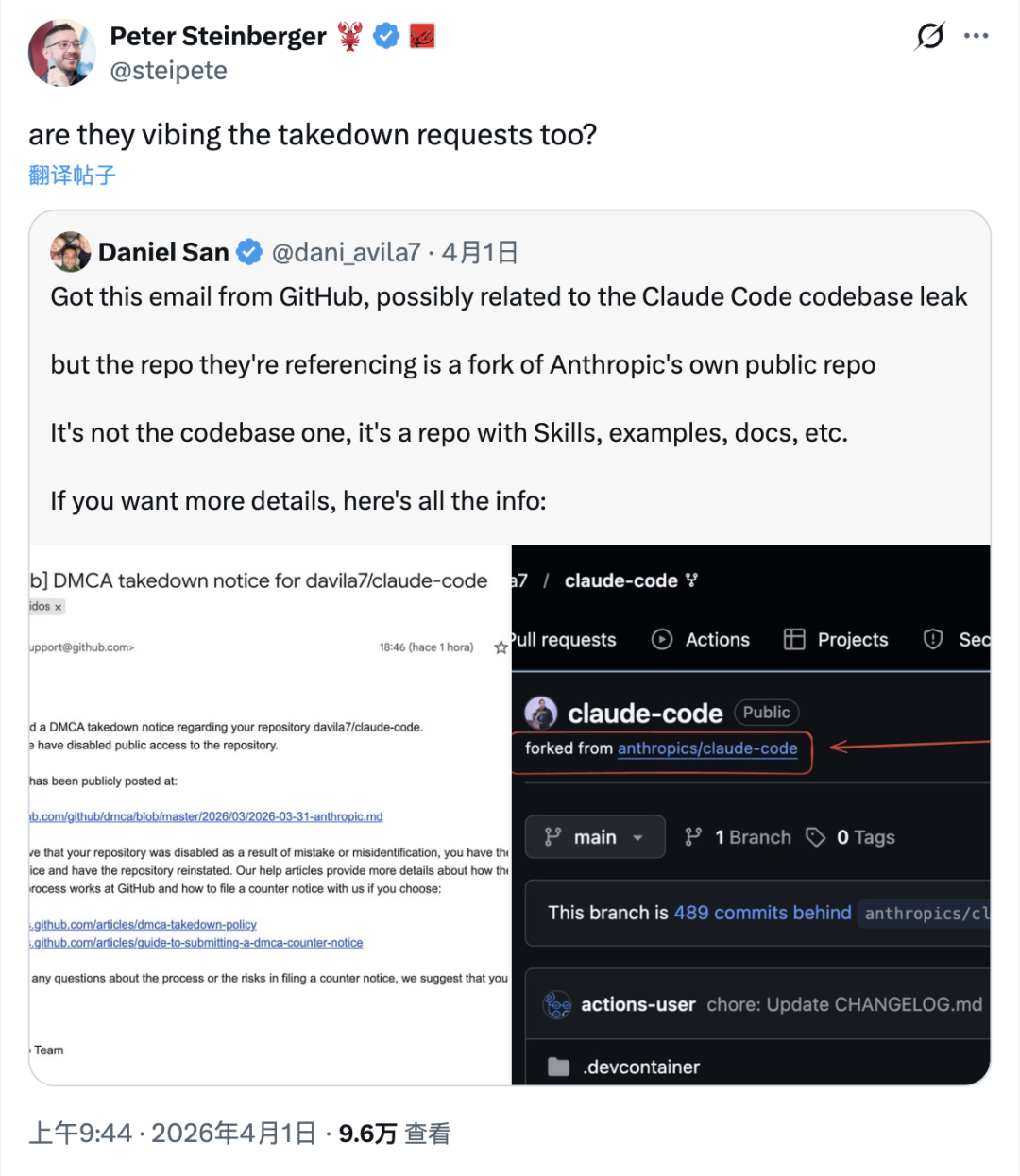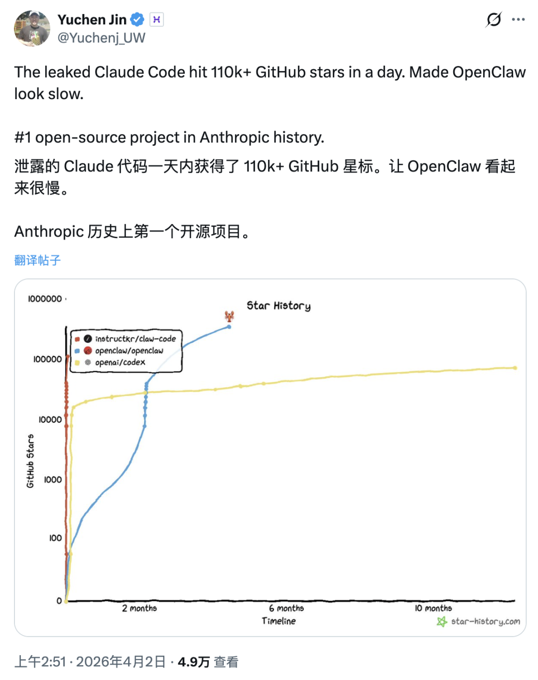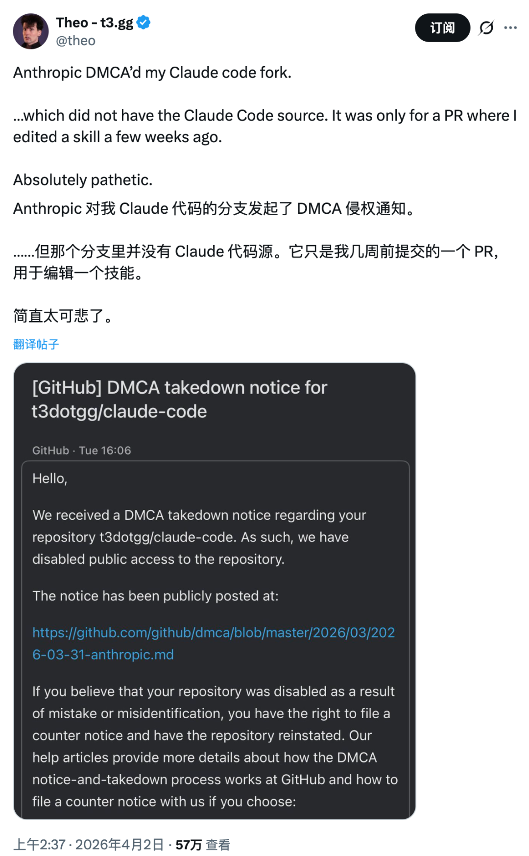 凌晨四点,韩国开发者 Sigrid Jin(instructkr)被手机震醒。消息铺天盖地:Claude Code 的底层源码被泄露了,开发者们正在疯狂转发、下载、存档。他的消息列表里全是同一件事。他也在第一时间拿到了那份代码,并上传到 GitHub 仓库。但未经授权持有、传播一家公司的专有源码,在美国版权法框架下,完全可能构成侵权。他的女朋友也提醒他:你可能要被起诉了。思考过后,他打开 OpenAI 的 Codex,连夜用 Python 从头重写了一遍,推上了 GitHub。2 小时,突破 50K。单日,超过 110K,成为 GitHub 史上增速最快的项目。Anthropic 在推送 Claude Code 更新时,打包出了问题。一个本不该公开的文件类型被上传到了 GitHub,这个文件指向内部源码,外人可以直接下载、直接阅读。正常情况下,Claude Code 的源码是经过混淆处理的,逆向极其困难。但这一次,保护层消失了。一个名为 Chaofan Shou 的 X 用户最先注意到这件事,截图发出,消息开始指数级扩散。几小时内,开发者们在 GitHub 上创建了超过 8000 份拷贝和衍生版本,每个人都在争分夺秒地把这份代码保存下来。而要理解这次事件的严重性,需要先搞清楚泄露的是什么。Claude Code 的底层,是 Anthropic 的 AI 模型,这部分没有泄露。泄露的,是套在模型之上的 harness。如果说,AI 模型是一匹马,harness 是缰绳和马鞍。模型提供原始能力,harness 决定骑手能否真正驾驭它、指挥它干活。Claude Code 之所以能让开发者用得顺手、效率极高,靠的正是这套精心设计的 harness 体系。这里面,包含 Anthropic 在工具调用、任务编排、上下文管理、模型行为调校上的全部积累。因此,竞争对手和无数开发者拿到的,是一张无需逆向工程的完整设计图。后续,Anthropic 的发言人随即回应:此次泄露「没有暴露任何客户数据」,也「没有泄露模型的权重参数」。公司声明将其定性为「打包时的人为失误,不是安全漏洞」,并表示正在推出措施防止重演。Claude Code 之父 Boris Cherny 也在 X 上简短留言,确认这只是「开发者的操作失误」。消息发酵后,马斯克也来凑了个热闹,转发网友调侃 Anthropic 现在比 OpenAI 更开放的帖子,并留下一句「太绝了😂」。面对失控的传播,Anthropic 启动了 DMCA 删除程序。DMCA,即《数字千年版权法》(Digital Millennium Copyright Act),是美国版权保护的主要武器。版权方向平台发出删除通知,平台需在审核后响应,否则可能连带承担侵权责任。Anthropic 初始提交的 DMCA 请求,覆盖了超过 8000 个 GitHub 账号。随后,自己意识到范围过大,把请求收窄到了 96 个账号。但伤害已经造成。比如开发者 Theo(YouTube 频道 t3.gg 主理人)被「DMCA」了。他的仓库里,根本没有任何泄露的 Claude Code 源码。唯一的关联,是他几周前编辑过一个 skill 的 PR(Pull Request),仅此而已。「这不是愚人节玩笑,这是对法律的违反,我会全力抗争,」Theo 在 X 上写道,并点名 GitHub,要求撤销 Anthropic 的删除请求。几小时后,他的仓库恢复了,但他没有收到任何通知。Theo 最终发了一条跟进推文:「看起来像是真实的失误,他们也迅速处理了。」2020 年,RIAA 向 GitHub 发出 DMCA 通知,指控 youtube-dl 绕过 YouTube 的版权保护机制,GitHub 随即下架了该仓库。事后电子前沿基金会(EFF)介入,证明投诉方误读了技术和法律,仓库最终恢复。GitHub 随后设立了 100 万美元防御基金,专门帮助开发者应对错误的 DMCA 投诉。这一次,Anthropic 这次的大范围误伤,多少让整个开源社区有种似曾相识的愤怒。尽管开发者 Sigrid Jin 的重写行为本身是有争议的,但从法律风险规避的角度看,这至少比持有原始代码更安全。他用的工具叫 oh-my-codex(OmX),@bellman_ych 开发的一个工作流框架,底层跑在 OpenAI Codex 上。原始的 TypeScript 代码库约有 51.2 万行,体量不小。他开了两个模式同时推进:$team 负责并行代码审查,$ralph 负责持续执行和架构验证,迅速完成了从 TypeScript 到 Python 的整体重写。并且,他号称全程没有复制一行原始代码。这里有个法律上的基本逻辑:版权只保护代码本身的写法,不保护背后的思路和设计。你把一个系统的架构摸清楚了,换一种语言重新实现出来,就像看完一本菜谱,自己下厨做出来,厨师管不着你。目前,Rust 版本已经在 dev/rust 分支上动工,API 客户端、运行时、工具执行框架、斜杠命令、插件模型这些模块都在计划里。Sigrid Jin 的项目 claw-code 最早发的是直接复制的原始代码,上线瞬间,star 数量几乎垂直拉升,2 小时突破 5 万,创下 GitHub 平台有史以来最快达成该里程碑的纪录。这个 stars 增长速度有多夸张,拿同期的 OpenClaw 来比就清楚了。OpenClaw 已经是这个时代增速最快的开源项目之一,一个本地 AI agent 框架,在今年 3 月初积累了超过 30 万 GitHub stars,超过了 React 的 24.3 万和 Linux 的 22 万。React 跑了 13 年,Linux 跑了 35 年,OpenClaw 用了不到 100 天。而就目前的增速来看,claw-code 比 OpenClaw 还快,而且快得多。更重要的是,AI 的介入也让今天开发者社区的复制、传播、重写速度,已经快到让版权武器有些跟不上节奏了。DMCA 能删掉 8000 个仓库,但删不掉工程师脑子里已经消化掉的架构思路。以前,把「理解」变成「可运行的代码」需要相当的时间和人力成本,这个时间差,某种意义上是版权执法的窗口期。现在这个窗口几乎关闭了。理解一套系统的架构,然后用 AI 辅助重写,几个小时就能完成。法律的节奏,和代码传播的节奏,已经完全不在同一个时间维度上。Claude Cod