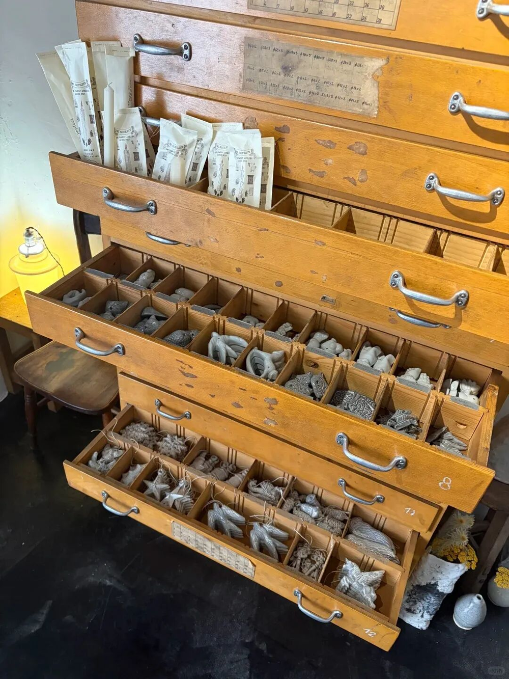 首尔的OJACRAFT,以灰白色调的白瓷为主,灯光精准地打在每一件器物上,墙上挂着铁丝立体装置,抽屉拉出来是整整齐齐的小格子,有香插、挂件、蜡烛等等。