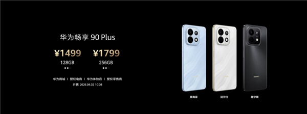 配置方面,畅享90 Pro Max搭载麒麟8000处理器,性能提升38%;屏幕采用6.84英寸1.5K OLED护眼直屏,支持120Hz高刷;影像方面配备5000万像素RYYB超感知主摄。外观上,该机继承Mate系列星环对称设计基因,提供飞天青、晨曦金等四款配色,质感远超同级。该机型将于4月2日开售。