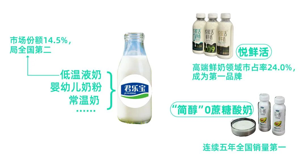 君乐宝的进攻是全方位的。业务横跨低温液奶、婴幼儿奶粉、常温奶等多个品类,且在多个细分赛道占据领先位置:低温液奶市场份额14.5%,位居全国第二;旗下“悦鲜活”在高端鲜奶领域市占率24.0%,成为第一品牌;“简醇”0蔗糖酸奶”连续五年全国销量第一。这种多点开花的布局,使其在“综合性乳制品公司”的排名中具备了话语权。