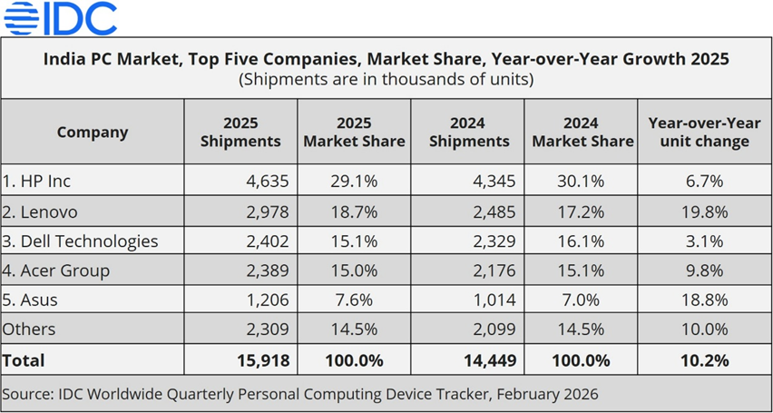 戴尔技术公司在 2025 年印度个人电脑市场中位居第三,市场份额为 15.1%。该公司实现了 18.3% 的同比增长,这得益于扩展的 AMD 产品组合以及强劲的企业需求,尤其是来自全球客户的订单需求。然而,在 2025 年上半年的库存清理以及 2025 年第四季度的供应限制导致整体出货量大幅下降 27.7%。尽管商业部门表现依然稳健,但在下半年,消费部门的出货量受到了影响。在 2025 年第四季度,戴尔在商业部门的市场份额为 24.0%,而在消费部门的份额为 9.2%。