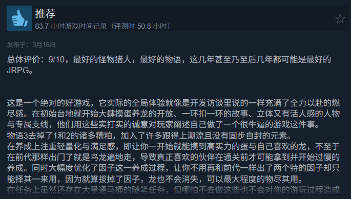 国内甚至有老玩家极尽赞美之词,称其为“最好的怪物猎人,最好的物语,这几年甚至后几年都可能是最好的JRPG”。海外也有大量玩家不吝啬“杰作、神作”的评价。