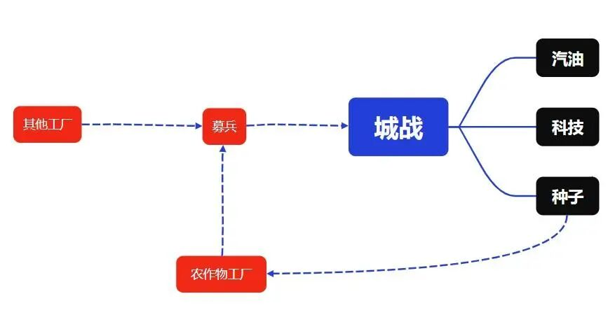 科技、汽油只在SLG部分起作用,与城内生产无关。种子是城内农作物工厂的原料,且联盟募兵需求中,农作物产品的权重较大,由此形成战略资源的闭环: