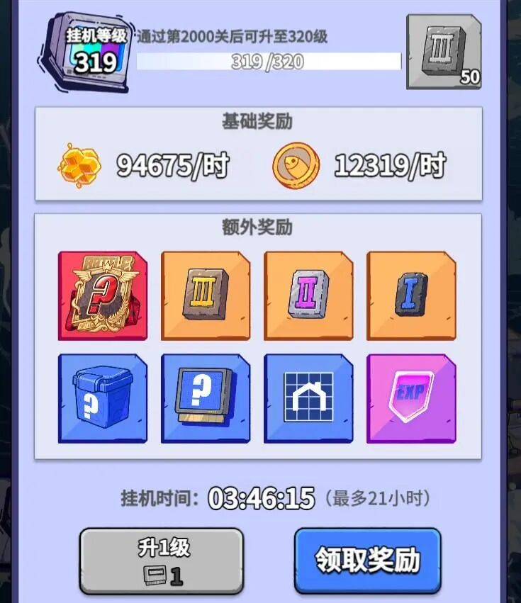 类似《咸鱼之王》《剑与远征》等典型放置卡牌产品,《疯狂水世界》中玩家只要闯过指定序号的关卡,就可以通过放置挂机获得包括红色徽章、专武材料在内的一系列核心养成道具。且同类道具下,挂机模块的产量显著高于其他模块。
