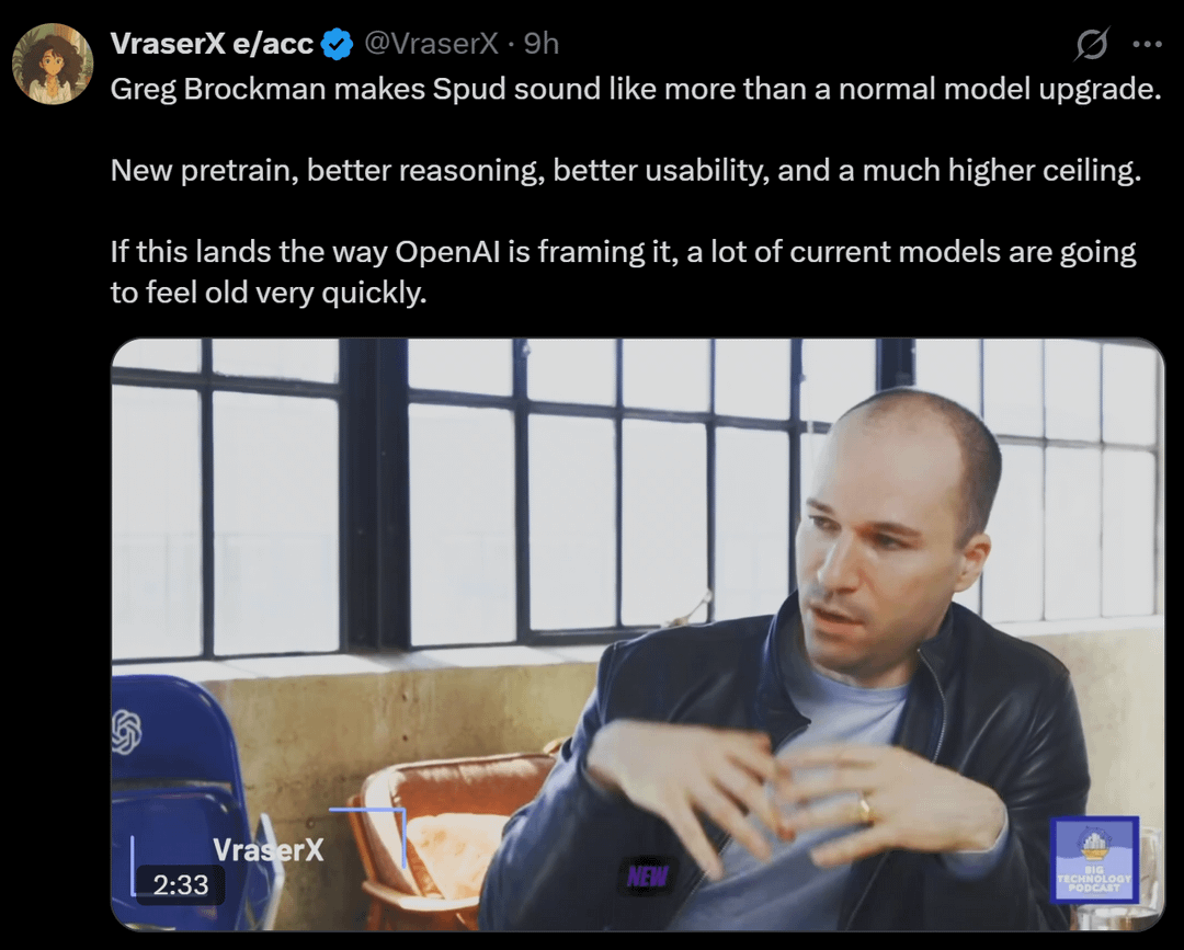 OpenAI 总裁 Greg Brockman 最近在播客访谈上亲口确认了它的存在:「这不是增量改进,而是我们思考模型开发方式的重大改变。」奥特曼同一天对全体员工的说法,再次拉高了预期:「一个非常强大的模型,可以真正加速经济发展。」Open AI 憋了两年大招,现在要放了,却在 OpenAI 最危险的时候。Brockman 在播客上没给跑分,没给发布日期,但他造了一个新词:「Big Model Smell」,大模型的气息。当这些模型真正变得更聪明、更有能力时,它会主动对齐你的意图(bend to you)。你不需要反复解释你想要什么,它就是知道。这话说得很玄,但信息量比任何 benchmark 都大。循例看看曝光的参数。泄露文档显示,GPT-6 在编码、推理和 Agent 任务上比 GPT-5.4 高出 40% 以上。上下文窗口从 GPT-5.4 的 100 万 token 直接拉到 200 万,翻了一倍。有传言称 Fields 奖得主陶哲轩据报道已经上手测过 GPT-6 的数学推理,这更令人期待了。Brockman 原话是「用户不必为同一请求输入多个提示」。三年了,ChatGPT 用户被「如何跟 AI 说话」折磨得够呛。如果 GPT-6 真能解决提示工程这个痛点,光这一项更新就值回票价。Agent 能力是另一个重头戏。更长程的自主运行,更少的人工确认循环。文本、图像、音频、视频原生统一处理,不是拼接,是同一个架构从底层就这么设计的。爆料里还有一句更猛的,Brockman 私下说 AGI 已经实现了 70% 到 80%,内部认为 GPT-6 会弥合大部分剩余差距。这话不管你信不信,至少说明 OpenAI 内部的判断已经到了这一步。GPT-5.4 已经把幻觉率比 GPT-5.2 降低了 33%。GPT-6 在这个基础上还要再降,具体数字还没出,但方向明确:让 AI 不再一本正经地胡说八道。Brockman 反复强调一个关键定位:GPT-6 是全新的基础模型,会成为 OpenAI 未来所有模型的底座。从 GPT-4 开始,OpenAI 花了两年多做渐进式更新(4o、4.5、5、5.2、5.4),但暗线上另一个团队在从零开始建新地基。根据 OpenAI 历史定价模式,旗舰模型通常在发布时定价较高,参考 GPT-5 Reasoning 为$15/百万输入 token。但目前爆料给出的数字是 2.5 美元输入、12 美元输出,跟 GPT-5.4 几乎持平。如果后者属实,OpenAI 等于也开始打价格战。同级别的 Claude Mythos 传闻定价在每百万 token 100 美元,ChatGPT Plus 和 Pro 用户大概率优先尝鲜。至于发布时间,多个爆料博主指出了 4 月 14 日 这个时间,但在官宣之前都不能确定,无论如何在 4 月发布的概率很大。GPT-6 完成预训练后不到 24 小时,OpenAI 宣布关停 Sora。同时被取消的还有与迪士尼价值 10 亿美元的角色授权协议。200 个迪士尼角色,Pixar、Marvel、Star Wars,一夜之间全没了。奥特曼亲自给迪士尼 CEO Bob Iger 打了电话。迪士尼新任 CEO Josh 的反应让他「感到非常糟糕」。但奥特曼 在最新长访谈也直接再次谈到关停 Sora:「核心在于算力,永远都是算力的问题。」Sora 每天烧掉大约 100 万美元的算力资源。钱倒不是最大的问题,但同一块 GPU 不足以同时供给视频模型和旗舰大模型训练。Sora 团队没被裁,转去做「世界模拟」研究,长期目标指向机器人。OpenAI 正在从消费级创意工具全面收缩,转向企业级生产力 AI。奥特曼还透露了一个更根本的原因。他发现如果 Sora 要在短视频领域取得成功,需要的产品逻辑会把公司拉向一条他不想走的路。那种商业模式可能会提出什么要求,以及我们为了获胜而做出的决策,是我们不愿做的。说白了,奥特曼不想让 OpenAI 变成另一个算法驱动的信息流工厂。这也相当于OpenAI 终于承认,自己摊子铺得太大了。在经历了过去一年眼花缭乱的产品发布,从视频生成模型 Sora 到各式各样的独立硬件、应用尝试后,这家 AI 巨头正在调转船头的方向。前段时间 APPSO 也介绍过,OpenAI 正在策划一场近年来最大的产品重组,GPT-6 就是关键的一环。ChatGPT + Codex + 浏览器 = GPT-6 超级应用GPT-6 不是一个孤立的模型,它是 OpenAI「超级应用」战略的底层引擎。OpenAI 目前的规划是让 GPT-6 同时驱动三个产品:ChatGPT 对话 AI、Codex 编程智能体、Atlas 内置浏览器。三者塞进一个桌面应用,对话、编程、上网、执行任务一键切换,预计 2026 年底前出预览版。奥特曼自己是 Codex 的重度用户,「这是自 ChatGPT 发布以来,我第一次感到自己用上了未来科技。」他把攒了好几年的副业项目清单全部用 Codex 跑完了,然后遇到了一个「奇怪的问题」:想不出更多点子了。一个让 CEO 跑完了 idea 清单的编程工具,接下来要接上一个更猛的模型。这就是 GPT-6 在产品层面的意思。同步发生的组织架构变动更有意思。OpenAI 产品部门正式更名为「AGI Deployment」。这是 AGI 这个词第一次出现在公司官方架构中。奥特曼本人把日常产品工作全部甩出去了,自己只干三件事:筹钱、抢芯片、建数据中心。他在访谈里承认自己现在「穿西装的次数比一生加起来还多」,而且「感觉更像一名政客,而非纯粹的创始人」。OpenAI 内讧?CEO 要上市,CFO 说没准备好技术上 all in 了。财务上呢?先看一组让 奥特曼晚上翻来覆去的数字。据 Next Round 资本创始人透露,近几周约六家机构投资者想出手总计约 6 亿美元的 OpenAI 股票。去年,这种量级的卖单通常几天内就被抢光。现在却几乎无人问津。二级市场给出的估值约 7650 亿美元,较峰值 8500 亿折价 10%。而同一时间,Anthropic 的二级市场估值较上一轮融资溢价超过 50%。钱正在从 OpenAI 流向它最大的对手。一级市场刚注入 1220 亿美元、估值 8520 亿的公
