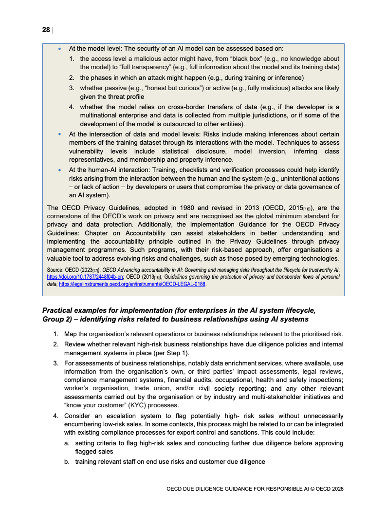 在此背景下,OECD提出以“风险为导向”的尽职调查体系作为核心治理工具。该体系由六个环节构成,包括嵌入治理机制、识别风险、缓释影响、跟踪结果、信息披露及补救机制。这一框架强调动态循环,而非一次性合规,其本质是将AI风险管理嵌入企业日常运营体系,实现从被动合规向主动治理转变 。