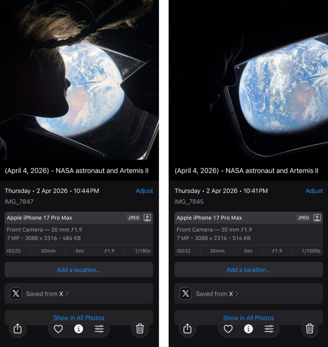 苹果估计也没想到,一分钱没花,白送了一个载入史册的广告。使用 iPhone 17 Pro Max 拍摄(克里斯蒂娜·科赫),相关图片出自官方网站,下同甚至有网友,将这张照片与阿波罗 8 号的《地出》相提并论——摄于 1968 年、人类首次从月球拍摄到的彩色地球、被誉为史上最具影响力的照片之一。两张照片之间,隔着 58 年,和人类重返月球的理想,和多年未能重返的遗憾。同一天,指挥官里德·怀斯曼拍了另一张。他没有写任何解释,配文只有短短一句话:「无法用语言形容。」这两张照片有个共同点,很多人没有注意到:它们都是自拍,用的是 iPhone 17 Pro Max 的前置摄像头,拍完在 Adobe Lightroom 里做了轻量调色。NASA 网站上可以查到每张照片的 EXIF 数据用 iPhone 17 Pro Max 在太空拍照,需要几步?第一步,当然得是把 iPhone 送上太空。美国当地时间 4 月 1 日,阿耳忒弥斯 II 号从肯尼迪航天中心发射升空。这是人类自 1972 年阿波罗 17 号以来,时隔 53 年再度飞向月球。机组共有四人:指挥官里德·怀斯曼、飞行员维克多·格洛弗、任务专家克里斯蒂娜·科赫,以及加拿大航天员杰里米·汉森。四人还刷新了多项历史纪录:科赫是首位进入深空的女性航天员,格洛弗是首位执行月球任务的黑人航天员,汉森是首位飞向月球的非美国籍航天员。只是,每位航天员都有一个被忽视的细节,他们的宇航服小腿口袋里,揣着一部 iPhone 17 Pro Max。NASA 在机组 3 月进入隔离期时便完成了发放。发射约四小时后,一部银色 iPhone 出现在舱内摄像头的画面里,从汉森手中漂过怀斯曼和格洛弗的头顶,落入科赫手中。2011 年,航天飞机任务 STS-135 曾携带两部 iPhone 4,运行一款名为 SpaceLab for iOS 的应用。当时,宇航员用 iPhone 的摄像头、陀螺仪等其它传感器,完成了四项实验。值得一提的是,同次任务也搭载了由谷歌开发、三星代工的 Nexus S。该手机也是第一部通过 NASA 认证的「商业智能手机」,接入了 SPHERE 自由飞行卫星。也就是说,在「第一台太空智能手机」这个竞赛上,iOS 和 Android 打了个平局。另外,那次任务,也是航天飞机时代的最后一次任务,意义非凡。2021 年,宇航员贾里德·艾萨克曼在指挥 SpaceX Inspiration4 商业任务时,也曾用 iPhone 在地球轨道拍照。他今天是 NASA 现任局长。这是 NASA 官方首次为每位绕月航天员人手配备 iPhone,并赋予其「完全适航」深空资格。苹果公司确认,本次是 iPhone 历史上首次通过完整的在轨及深空延伸使用认证,且苹果方面并未参与 NASA 的认证流程。在深空环境里,一个细节就能说明一切:任务第一天,怀斯曼向休斯顿报告,他的 Microsoft Surface Pro 平板上两个 Outlook 账户全部罢工,请求地面远程介入排查,而地面团队给出的解决方案是「重启试试」。NASA 飞行主任朱德·弗里林解释,这类故障在空间站任务中并不罕见,通常由软件在无直连网络环境下身份验证逻辑死循环引发。消息一经传出,海外网友很难不共情:在距地三万英里的深空以每小时 4275 英里飞行,依然逃不开 Outlook 崩溃的噩梦🤣笑完之后,这件事其实说明了一个更严肃的现实。失重、辐射、密闭、离线,四重条件叠加,深空环境的容错空间几乎为零。任何一个软件或硬件的小故障,都可能滚成大麻烦。所以进飞船的每件硬件,都要过 NASA 的安全认证。科罗拉多大学博尔德分校 BioServe 空间技术研究所研究员托比亚斯·尼德威泽,专门介绍了这套流程。第一阶段,将该硬件提交安全评审委员会审查。第二阶段,识别硬件的潜在危害,涵盖活动部件、玻璃等易碎材料等各类风险。第三阶段,制定针对上述危害的应对方案。第四阶段,验证该方案切实有效。iPhone 17 Pro Max 被装进宇航服里虽然是智能手机,但这几台通过认证的 iPhone 17 Pro Max,实质上其实只是功能高度精简的影像终端。蜂窝、Wi-Fi 和蓝牙永久关闭,航天员在月球轨道上无法刷社交媒体,无法收发即时消息,也无法使用无线耳机,FaceTime 更是无从谈起。手机唯一保留的核心功能,是拍照和录像。这一限制的逻辑无可辩驳:猎户座飞船的主导航与通信系统容不得任何外部电磁干扰,哪怕是一部消费级手机主动扫描 Wi-Fi 信号,都是潜在的隐患。毕竟这不是坐民航飞机,关不关手机,其实没人能真的管得住你……任务第二天,这两张回望地球的画面,就此诞生,怀斯曼在任务反馈中强调,iPhone 让他们能以更「平民化」的视角向世界展示深空生活,而 iPhone 17 Pro Max 显然并非是这次任务中唯一的影像设备,其在整套拍摄体系中承担的是辅助角色。真正完成关键科学影像归档的,是两台尼康 D5 单反,和一台 Z9 无反相机。尼康与 NASA 的合作由来已久,目前国际空间站的主力相机正是尼康 Z9,这台旗舰无反配备约 4571 万像素堆栈式 CMOS 传感器,支持 8K/30p 及 4K/120p 视频录制,其 4 轴可翻折屏幕更是让航天员能在狭小空间内从各种角度拍摄。此外,阿耳忒弥斯 II 号上的尼康相机,也配备了专业级尼康镜头,主要用于拍摄高分辨率月面地质特征和飞船外部结构。任务第四天,宇航员会用尼康拍下月球奥里恩塔莱盆地的完整轮廓,这是人类历史上首次用肉眼观测到该区域全貌。这批影像的科学价值,显然无法被 iPhone 替代:高精度色彩还原、可预期的物理成像逻辑,以及不介入计算摄影处理的原始信息,都是地质分析不可或缺的基础。飞船外部还安装了四台 GoPro 负责外景拍摄,令人意外的是,部分画面竟是由 2014 年发布的