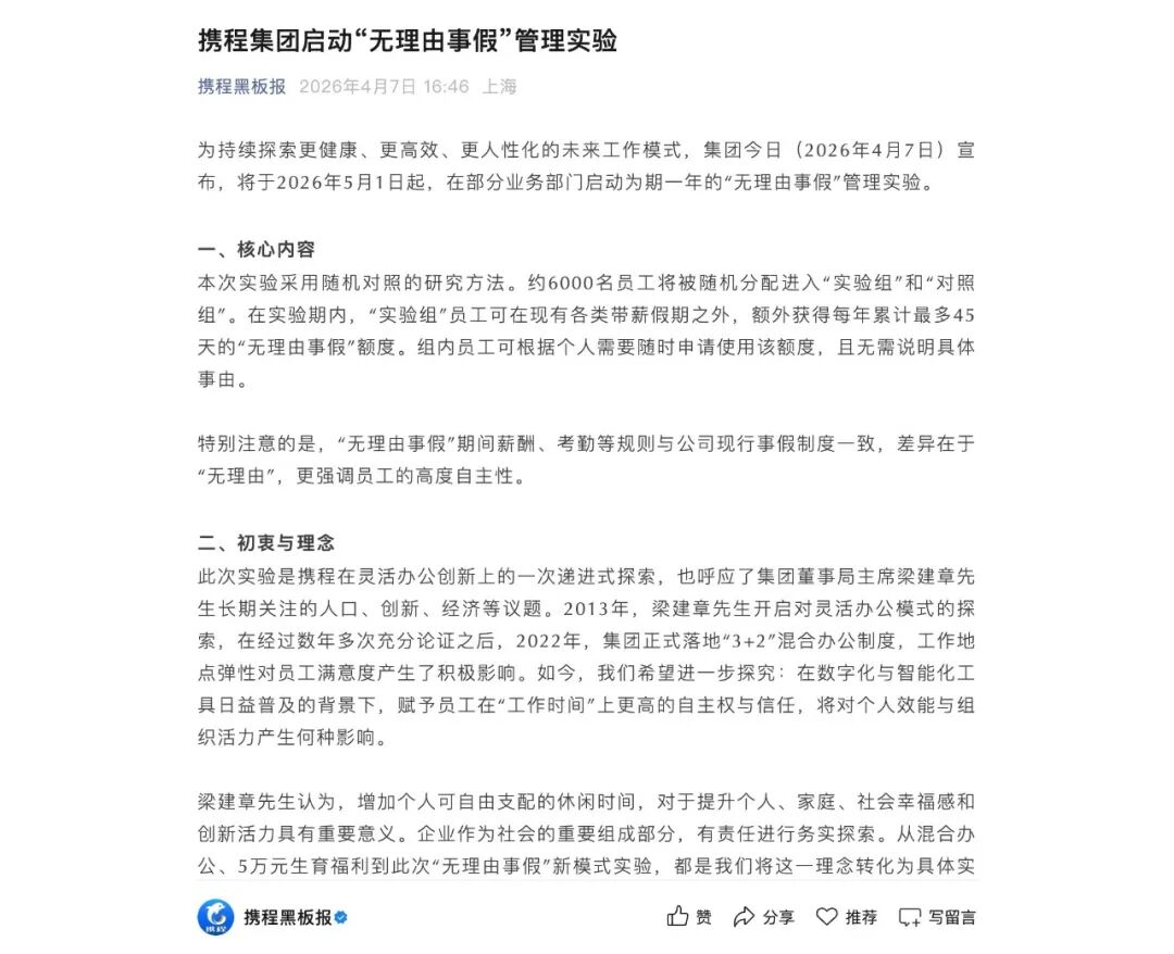 携程集团昨日宣布,将于 5 月 1 日起在部分业务部门启动为期一年的「无理由事假」管理实验,旨在探究赋予员工工作时间更高自主权后,对个人效能与组织活力的影响。本次实验采用随机对照研究方法,约 6000 名员工将被随机分配至实验组和对照组。实验组员工可在公司现有各类带薪假期之外,额外获得每年累计最多 45 天的「无理由事假」额度,员工可根据个人需求随时申请,且无需向公司说明具体事由。携程表示,集团将与专业学者合作,对实验数据进行严谨分析,并计划在适当时机与业界分享发现与思考。「无理由事假」制度是否最终正式落地,将取决于一年实验期内的实际观察结果。英特尔加入马斯克 Terafab 项目,与特斯拉、SpaceX 联手造芯