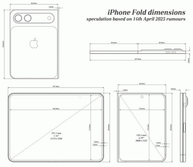 关于折叠 iPhone,爱范儿此前进行过多次报道,这大概会是一台「阔折叠」手机,外屏和内屏有可能落在 5.5 寸和 7.8 寸附近,由于是特殊的设计比例,其生产难度相当之高。