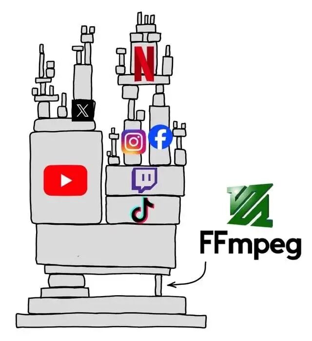 最典型的是 FFmpeg,这个开源的视频处理库,负责视频的解码、编码和转换。YouTube、Netflix、Bilibili、微信视频号、VLC 播放器,几乎所有需要播放或处理视频的软件都直接或间接依赖它。你每天在手机上看视频的时候,FFmpeg 的代码很可能正在你的设备上运行。