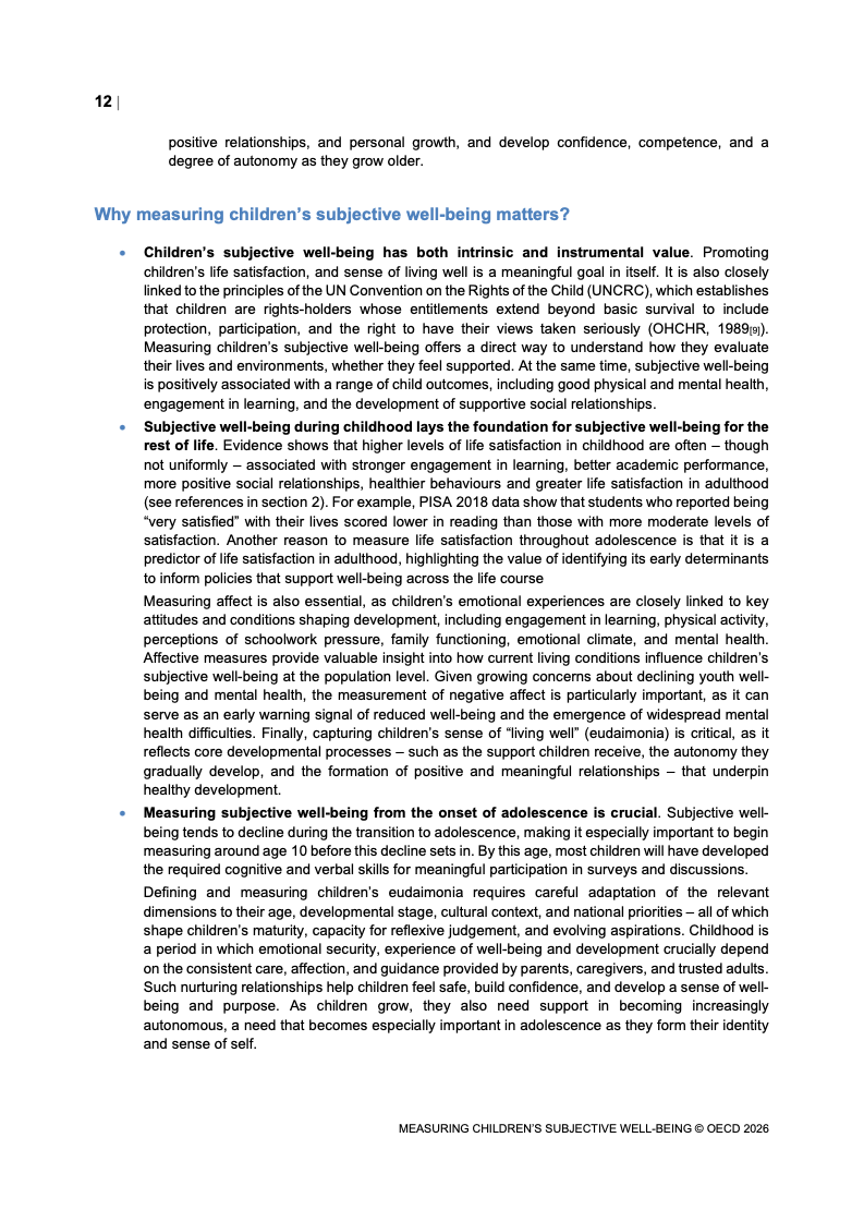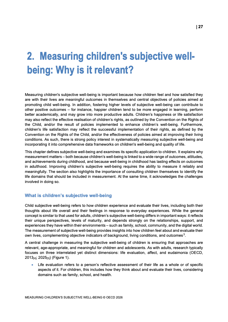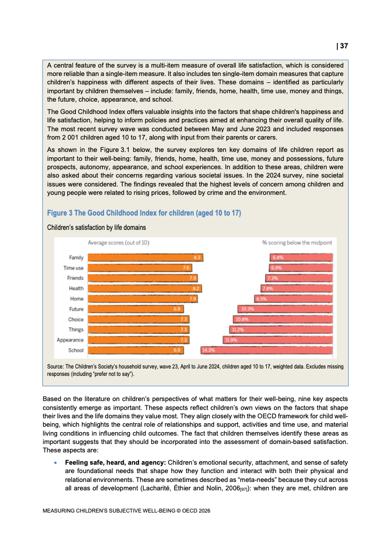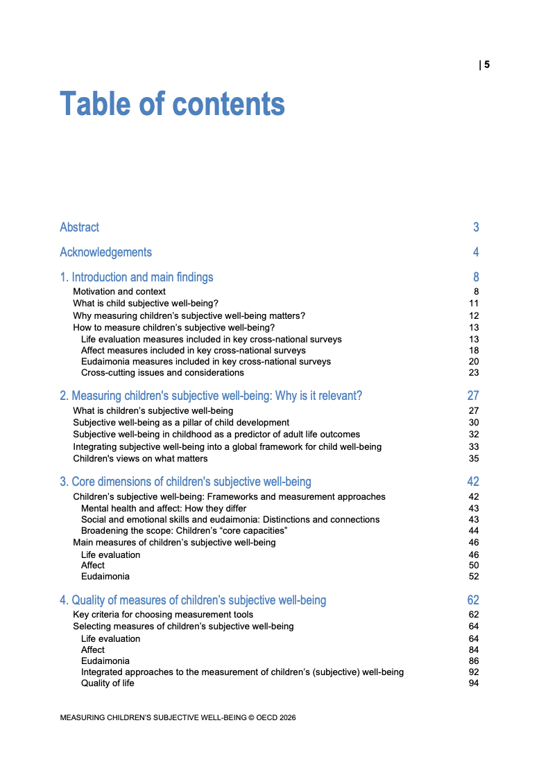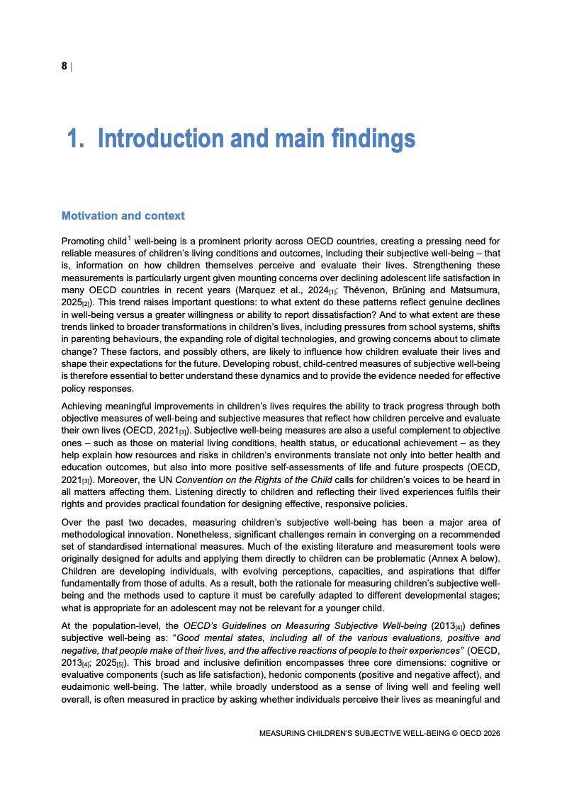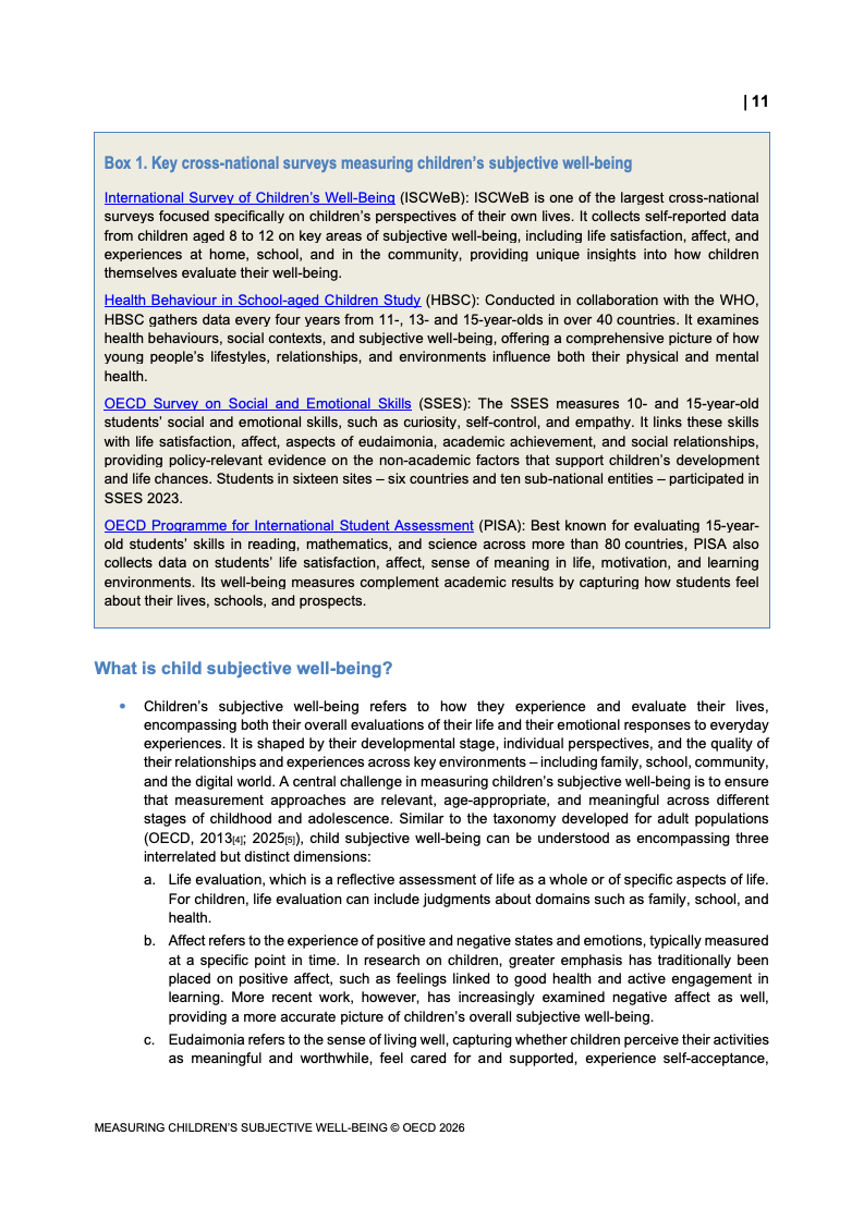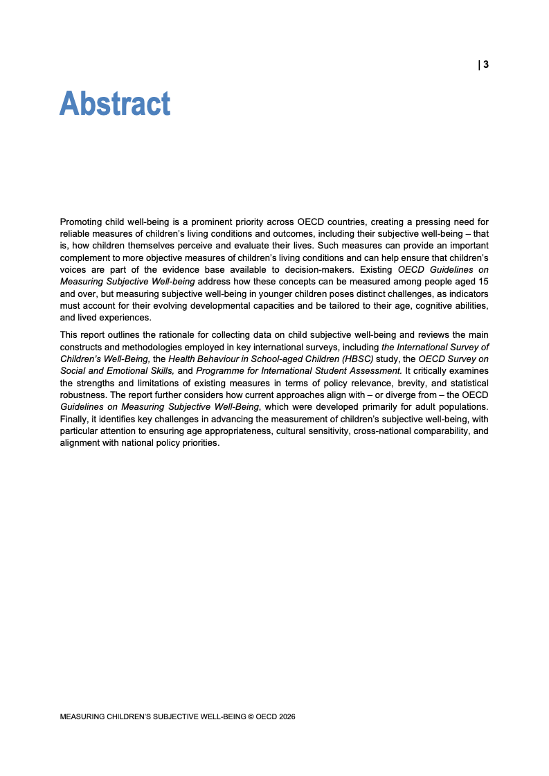 该报告围绕儿童主观幸福感的测量逻辑展开,核心在于将儿童自我感知纳入政策评估体系,以弥补传统以收入、教育和健康为主的客观指标不足。研究显示,近年来OECD多国青少年生活满意度出现下行趋势,这一现象不仅与教育压力、家庭结构变化及数字化环境扩张有关,也可能受到表达能力增强与社会比较加剧的影响。主观幸福感因此被视为理解儿童发展质量与社会变迁的重要前瞻性指标,其政策价值显著提升。