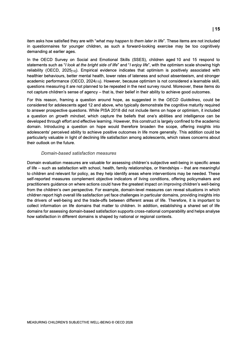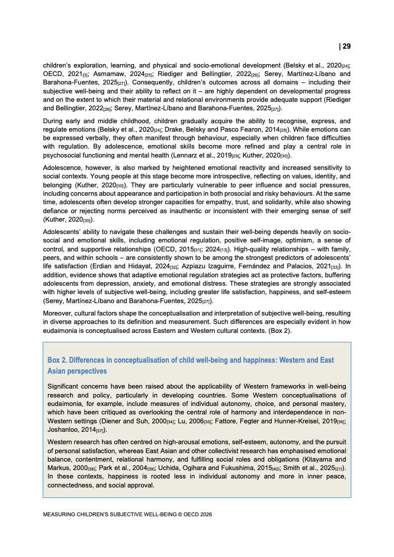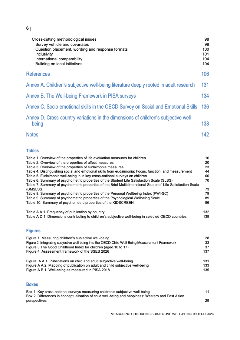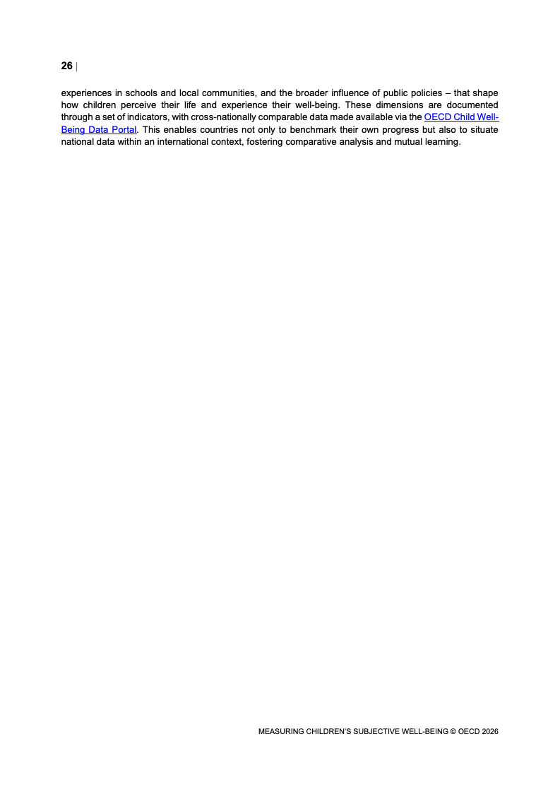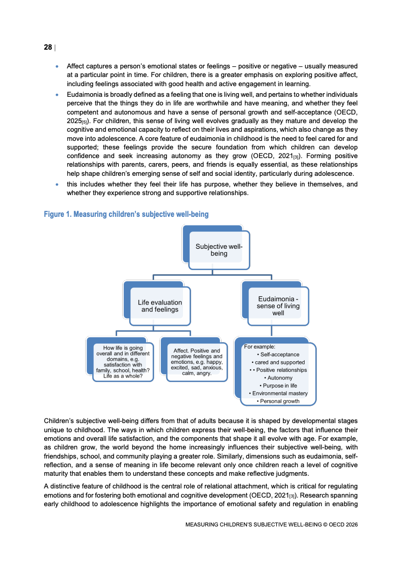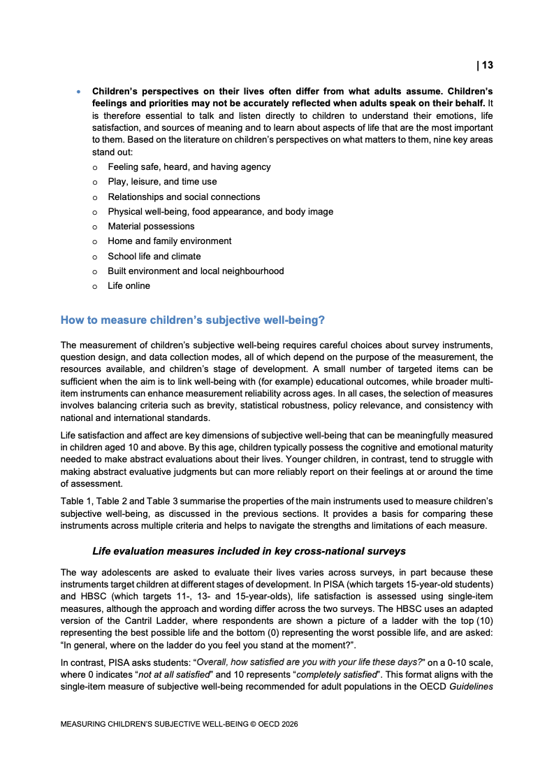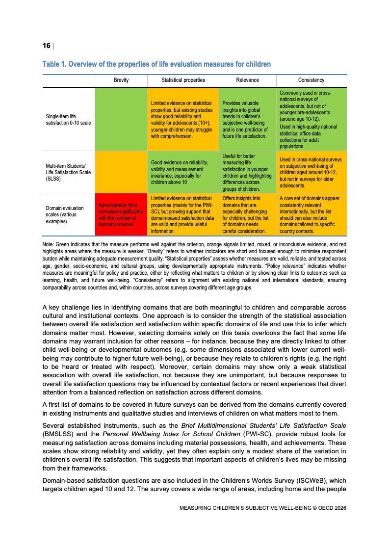该报告围绕儿童主观幸福感的测量逻辑展开,核心在于将儿童自我感知纳入政策评估体系,以弥补传统以收入、教育和健康为主的客观指标不足。研究显示,近年来OECD多国青少年生活满意度出现下行趋势,这一现象不仅与教育压力、家庭结构变化及数字化环境扩张有关,也可能受到表达能力增强与社会比较加剧的影响。主观幸福感因此被视为理解儿童发展质量与社会变迁的重要前瞻性指标,其政策价值显著提升。
