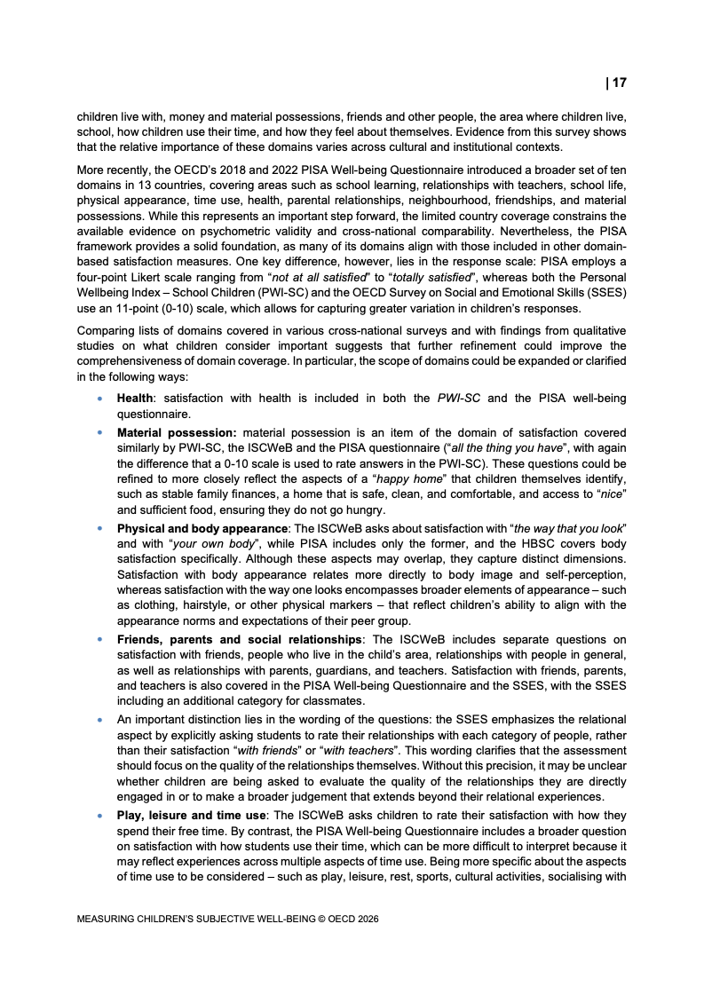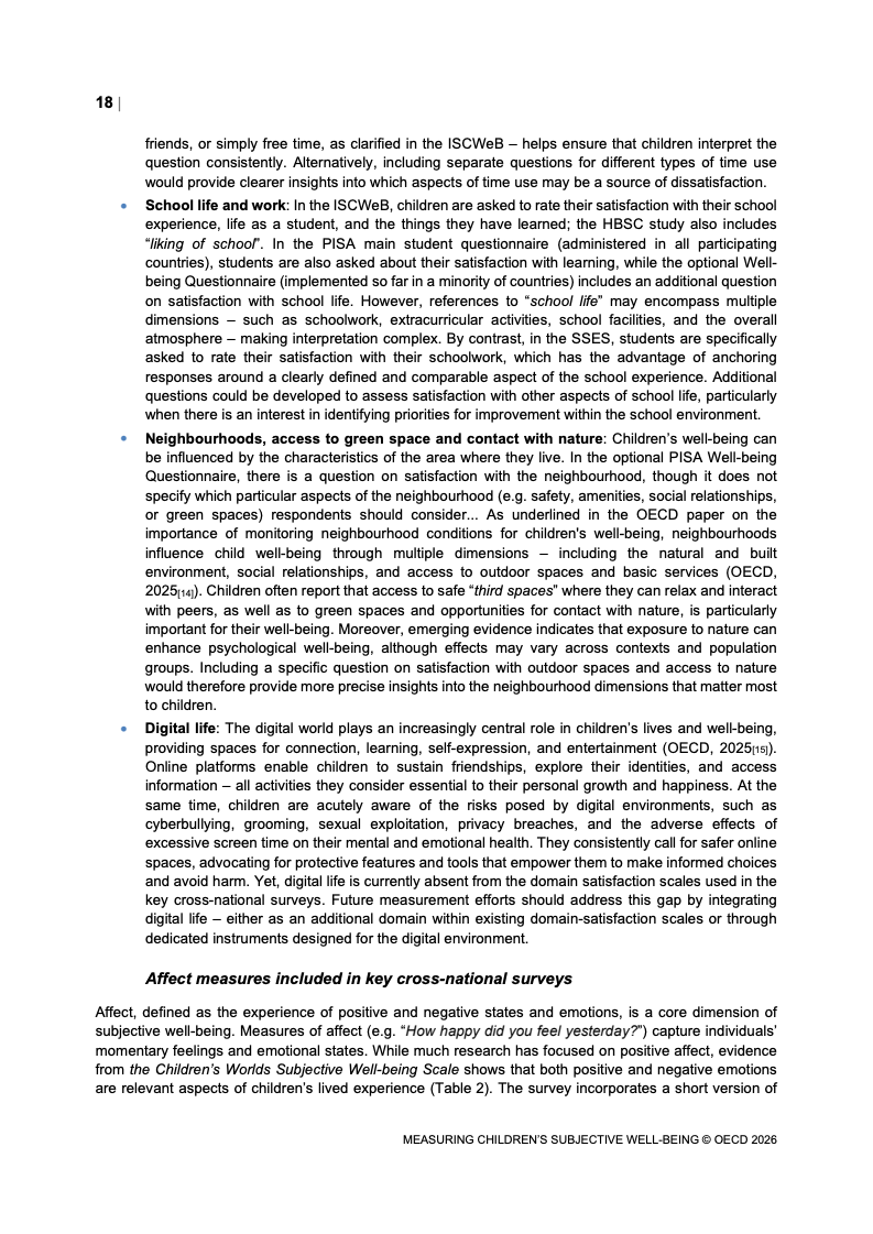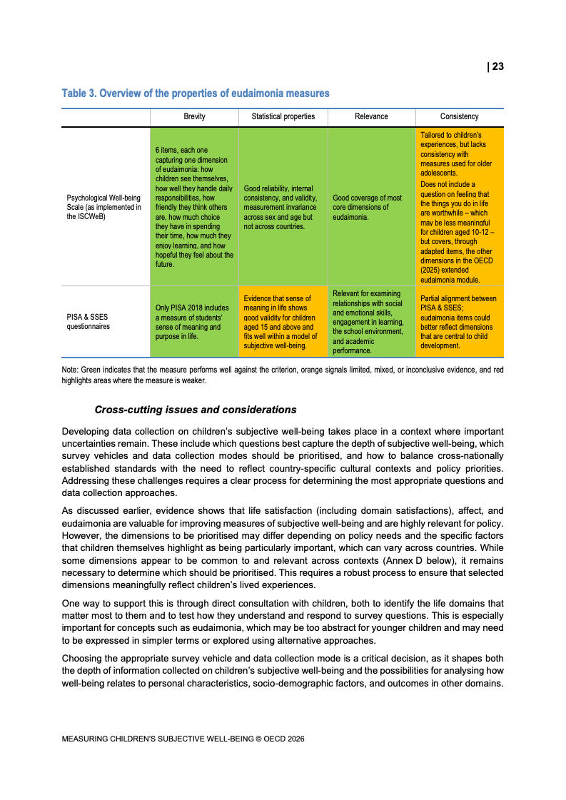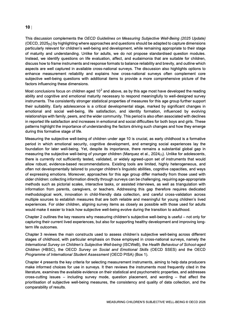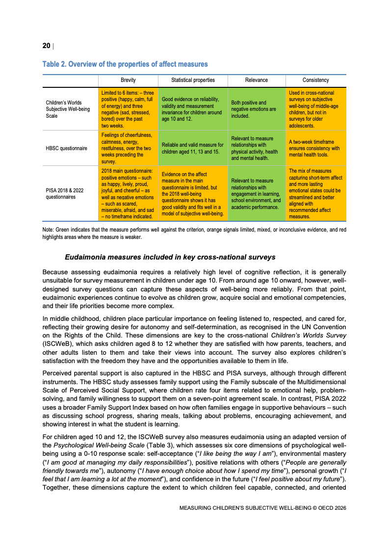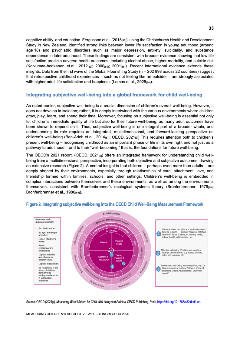 该报告围绕儿童主观幸福感的测量逻辑展开,核心在于将儿童自我感知纳入政策评估体系,以弥补传统以收入、教育和健康为主的客观指标不足。研究显示,近年来OECD多国青少年生活满意度出现下行趋势,这一现象不仅与教育压力、家庭结构变化及数字化环境扩张有关,也可能受到表达能力增强与社会比较加剧的影响。主观幸福感因此被视为理解儿童发展质量与社会变迁的重要前瞻性指标,其政策价值显著提升。