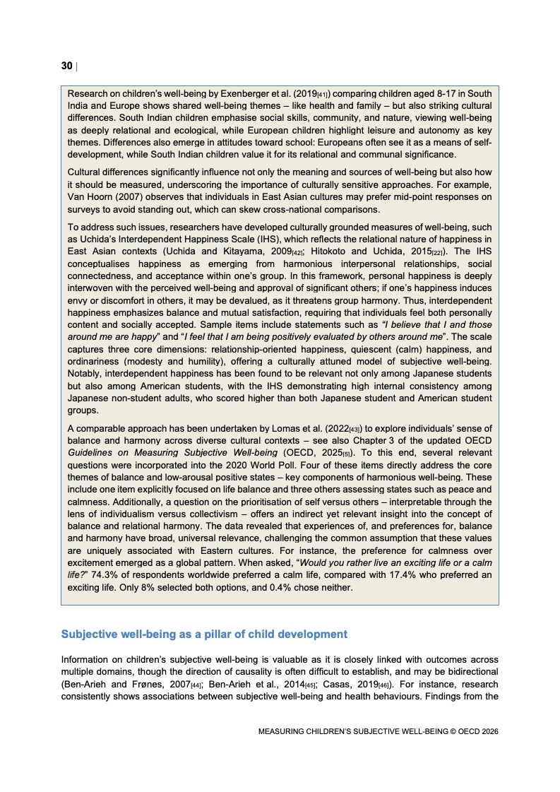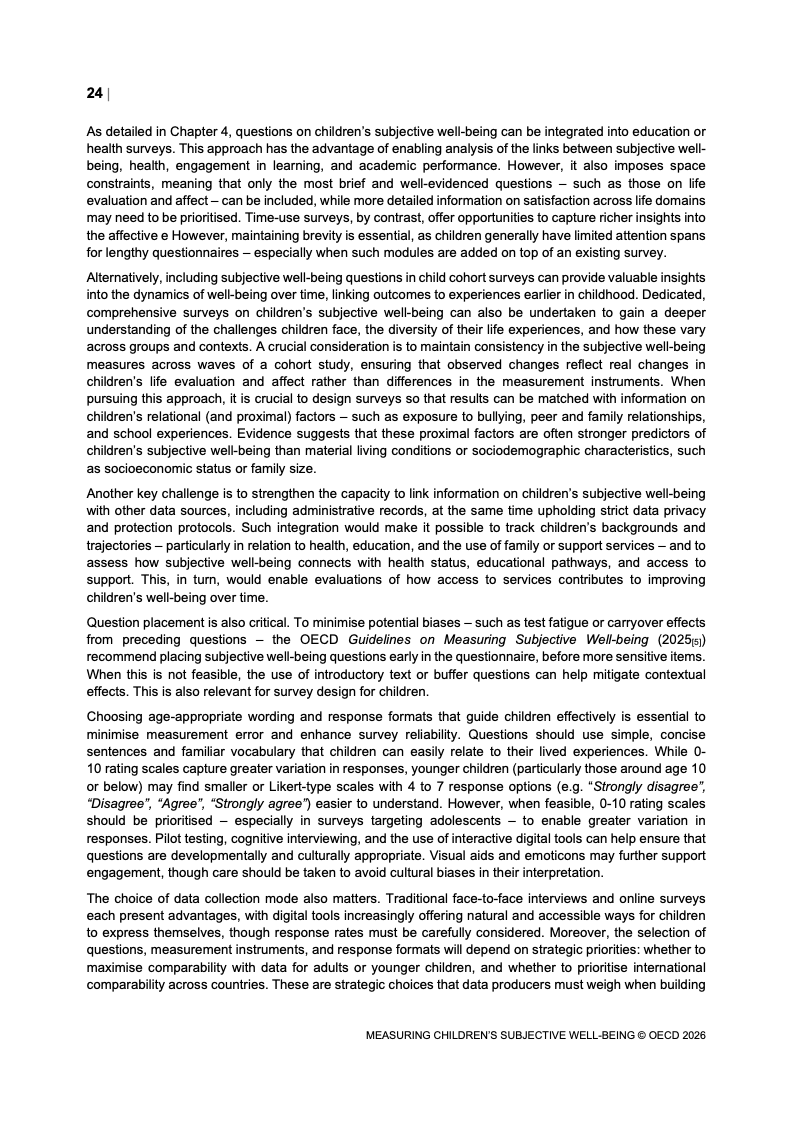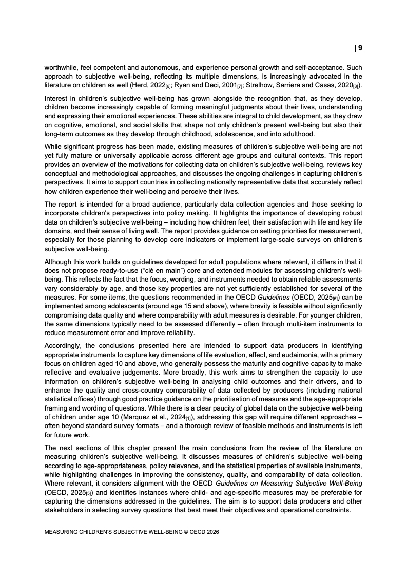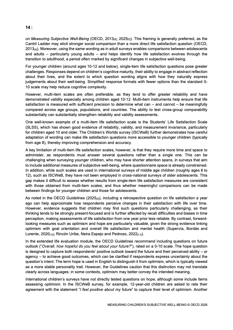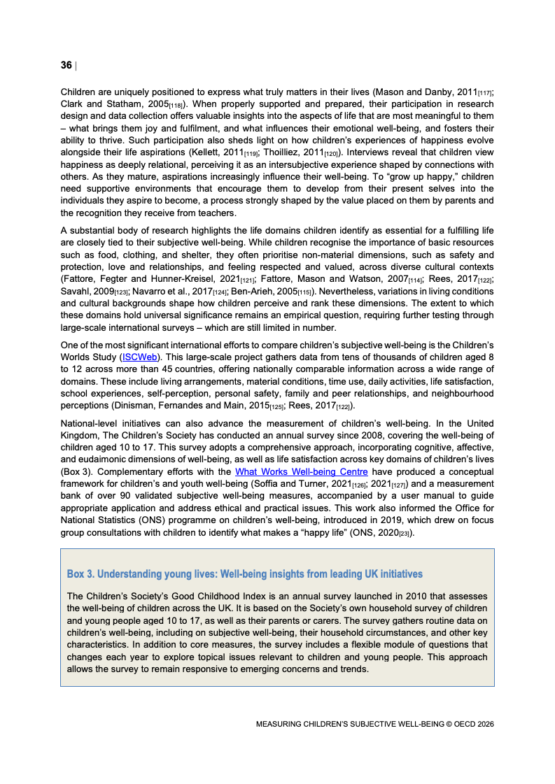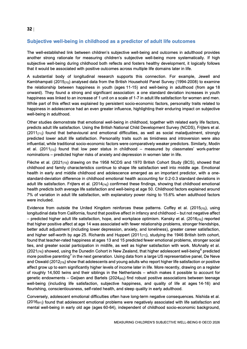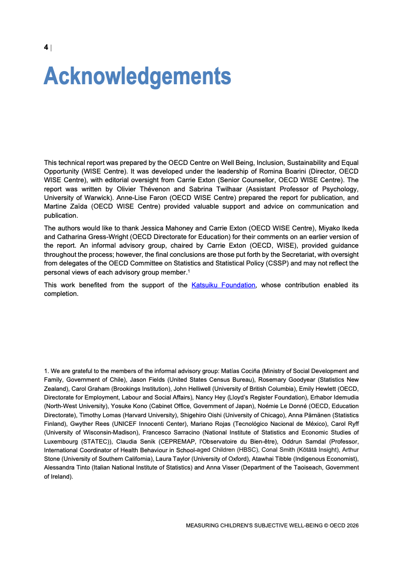 该报告围绕儿童主观幸福感的测量逻辑展开,核心在于将儿童自我感知纳入政策评估体系,以弥补传统以收入、教育和健康为主的客观指标不足。研究显示,近年来OECD多国青少年生活满意度出现下行趋势,这一现象不仅与教育压力、家庭结构变化及数字化环境扩张有关,也可能受到表达能力增强与社会比较加剧的影响。主观幸福感因此被视为理解儿童发展质量与社会变迁的重要前瞻性指标,其政策价值显著提升。