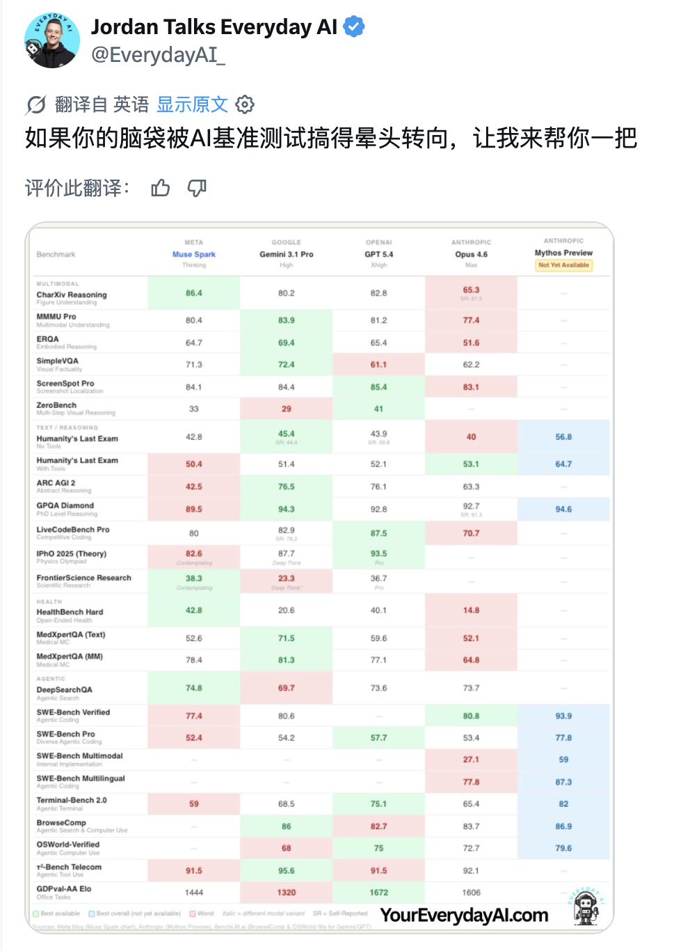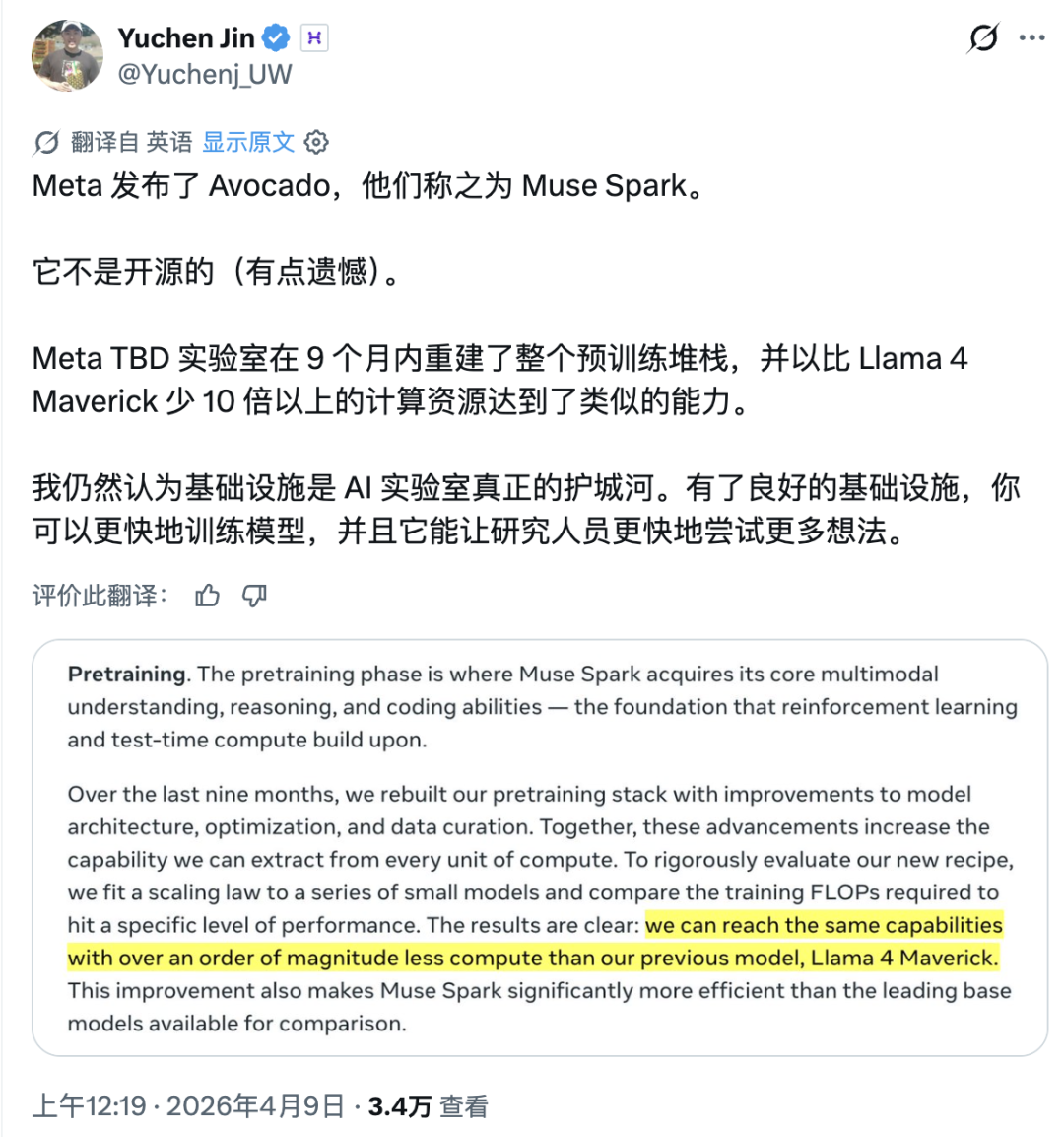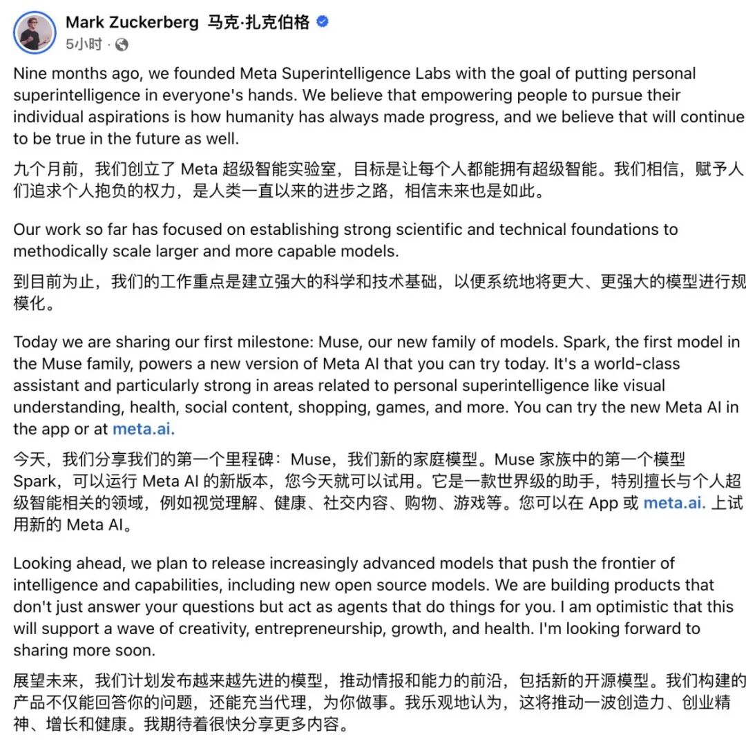 九个月前,如果你问 AI 圈里谁最焦虑,答案大概率是 Meta CEO 扎克伯格。Llama 4 的发布堪称教科书级翻车。核心研究员陆续出走,技术社区的口碑几乎在一夜之间崩掉,于是扎克伯格选择推倒重来。Meta Superintelligence Labs 挂牌成立,接着小扎开出堪比 NBA 职业球星的签约金,从 OpenAI、Google、Anthropic 撬走七十多名顶尖研究员,并在六个月内完成了四次组织架构调整。就在刚刚,这场 AI 豪赌终于亮出了它的第一张牌:Muse Spark。近千亿美元的支出给了扎克伯格一张 AI 顶级玩家的入场券,但入场从来只是开始,能不能在这张桌子上赢下去,还要看今天这张牌打得怎么样。号称「个人超级智能」第一步,Muse Spark 登场作为 Meta Superintelligence Labs 推出的 Muse 系列首款模型,Muse Spark 从架构层面原生支持图像、音频、视频与文本的联合理解,内置工具调用、可视化思维链与多智能体协调能力。Meta 将其定位为迈向「个人超级智能」的第一步。从评测数据看,Muse Spark 的能力分布相当不均匀。多模态方向上,它在 CharXiv Reasoning 图表理解项目上得分 86.4,超过 GPT 5.4 的 82.8 和 Gemini 3.1 Pro 的 80.2,SimpleVQA 视觉事实题同样领先竞争对手。但在 MMMU Pro 多模态理解项目上,Muse Spark 得分 80.4,低于 Gemini 3.1 Pro 的 83.9。文本推理方向,它在 GPQA Diamond 博士级推理题上得分 89.5,LiveCodeBench Pro 竞争编程测试得分 80.0,后者超过 Opus 4.6。然而 ARC AGI 2 抽象推理谜题上仅得 42.5,远落后于 Gemini 3.1 Pro 的 76.5 和 GPT 5.4 的 76.1,差距颇为明显。HealthBench Hard 开放式健康问答中,Muse Spark 得分 42.8,远超 GPT 5.4 的 40.1、Gemini 3.1 Pro 的 20.6 和 Opus 4.6 的 14.8。MedXpertQA 多模态医疗题得分 78.4,Meta 与超过 1000 名医生合作标注训练数据,这一投入在评测榜单上得到了直接回报,也是少见的、钱花到了刀刃上的地方。编码与智能体任务则是另一面。Muse Spark 在 DeepSearchQA 智能体搜索项目上得分 74.8,优于 Gemini 3.1 Pro 的 69.7,但在 Terminal-Bench 2.0 终端编码任务上仅得 59.0,落后于 GPT 5.4 的 75.1 和 Gemini 3.1 Pro 的 68.5。基准测试之外,社区的实战对比更为直观:有用户同时让 Muse Spark 和 GPT-5.4 完成「制作一个 Flappy Bird 克隆版」的任务,从游戏逻辑到交互细节,GPT-5.4 轻松胜出。在经典的六边形小球测试中,对比昨天 DeepSeek 专家模式的表现,Muse Spark 再次败下阵来。只能说,编码与长链路智能体任务,仍是 Meta 明确承认、尚在补强的方向。与标准推理模式并行,Meta 同步推出了 Contemplating 模式,通过并行调度多个 AI 智能体协作处理复杂问题。该模式在「人类最后的考试」(Humanity’s Last Exam)无工具版本中得分 50.2,超过 Gemini 3.1 Deep Think 的 48.4 和 GPT 5.4 Pro 的 43.9,FrontierScience Research 科学研究任务中得分 38.3。但在物理奥赛 IPhO 2025 理论题上得分 82.6,仍落后于 GPT 5.4 Pro 的 93.5。支撑上述能力的,是 MSL 过去九个月彻底重建的技术栈。Codebase Perplexity 测试图表显示,Muse Spark 在相同性能水平下,比 Llama 4 Maverick Base 节省 10.3 倍算力,比 DeepSeek-V3.1 Base 节省 8.2 倍,比 Kimi-K2 Base 节省 3.3 倍。强化学习阶段同样表现稳定,pass@1 从约 46% 持续爬升至超 60%,pass@16 从 近 68% 升至近 80%,在未见过的评测集上泛化趋势同样平稳。博主 Yuchen Jin 评价称,基础设施才是 AI 实验室真正的护城河,好的基础设施让研究人员能以更快速度训练模型、用更短周期验证更多想法。AI 评测机构 Artificial Analysis 在早期测试后表示,Muse Spark 在其综合智能指数中得分 52,位列全球前五。Muse Spark 现已上线 及 Meta AI 应用,并向部分用户开放 API 内测,用户须以 Facebook 或 Instagram 账号登录方可使用。与此前开源 Llama 系列的路线不同,Meta 这次选择闭源发布。Meta 未明确说明是否会使用社交账号中的个人信息训练模型,但鉴于 Meta 的一贯做法,这一可能性不低,其中健康数据的采集更是值得特别关注。2025 年 4 月,Llama 4 以令人失望的表现触发了 Meta 的人事地震。下定决心从头来过的扎克伯格,成立了 Meta Superintelligence Labs,以 143 亿美元将 Scale AI 创始人 Alexandr Wang 引入担任首席 AI 官,前 GitHub CEO Nat Friedman 负责产品,前 OpenAI 研究员 Shengjia Zhao(赵晟佳)出任首席科学家。紧接着是四大团队的重组、以及从 OpenAI、DeepMind、Anthropic 等对手处累计引进逾 70 名顶尖研究人员,单人签约奖金最高达 1 亿美元。代价是沉重的,图灵奖得主 Yann LeCun 离职、600 个岗位被裁、内部薪酬不公引发大规模士气危机,六个月内四次架构调整更是让团队方向感严重缺失。结果显而易见,九个月重建、数百亿投入,Muse Spark 交出的这份答卷,称得上合格,却还远远谈不上亮眼。有一个有趣的细节是,Meta 在评测图表中,通过给自家模型基准测试成绩高亮的操作,试图制造出全面领先的视觉观感,随即引发外界批评。网友 Armen Aghajanyan 直接定性为「图表犯罪」,Alexandr Wang 随后公开致歉,承认大多数评估恰恰显示模型有很多需要改进的地方。事实上,Meta 新模型在健康领域的垂直优势足够亮眼,算力效率的提升也确有真实价值,但 ARC AGI 2 上的断崖式落差、编码任务上被 GPT-5.4 轻松超越,以及「图表犯罪」风波所折射出的叙事焦虑,共同勾勒出一个仍在追赶、而非遥遥领先的 Meta AI。更关键的是,这是一份闭源答卷。Meta 曾以开源 Llama 系列树立起差异化形象,如今转向闭源商业化路线,意味着它放弃了社区生态这张最重要的底牌,却尚未证明自己能在闭源赛